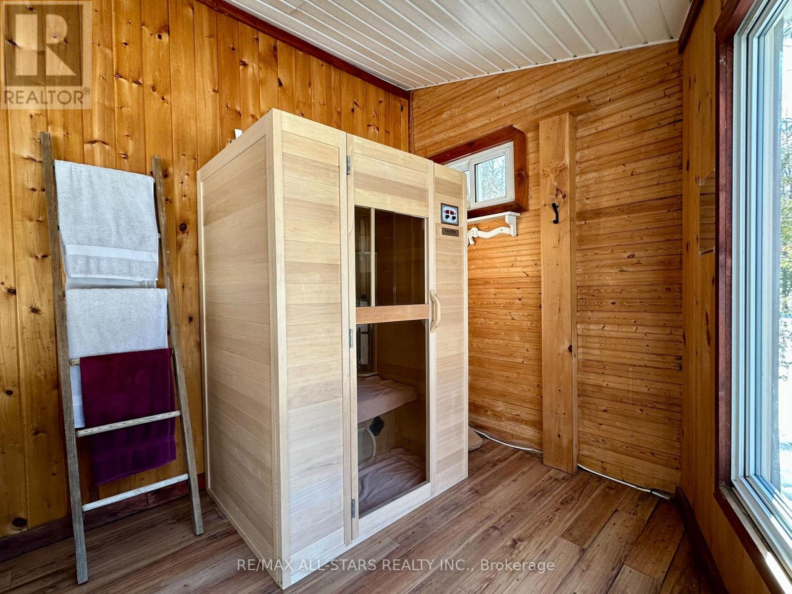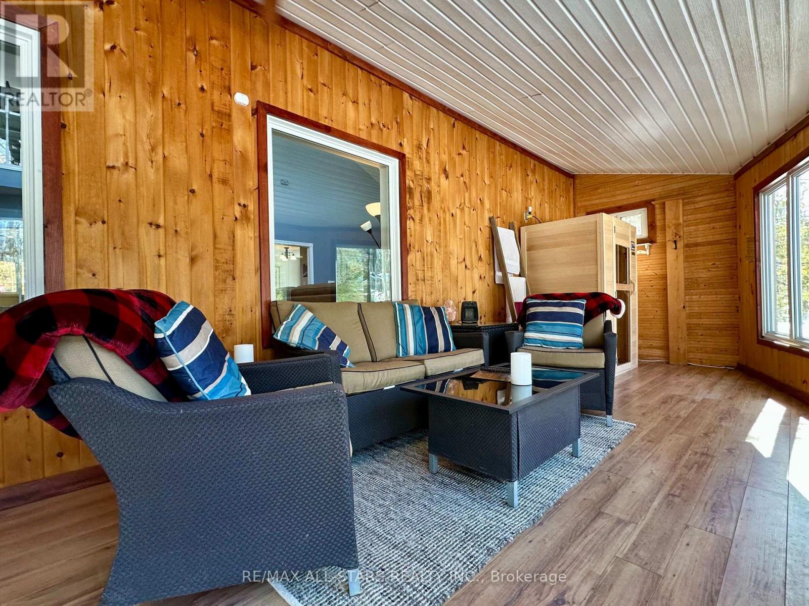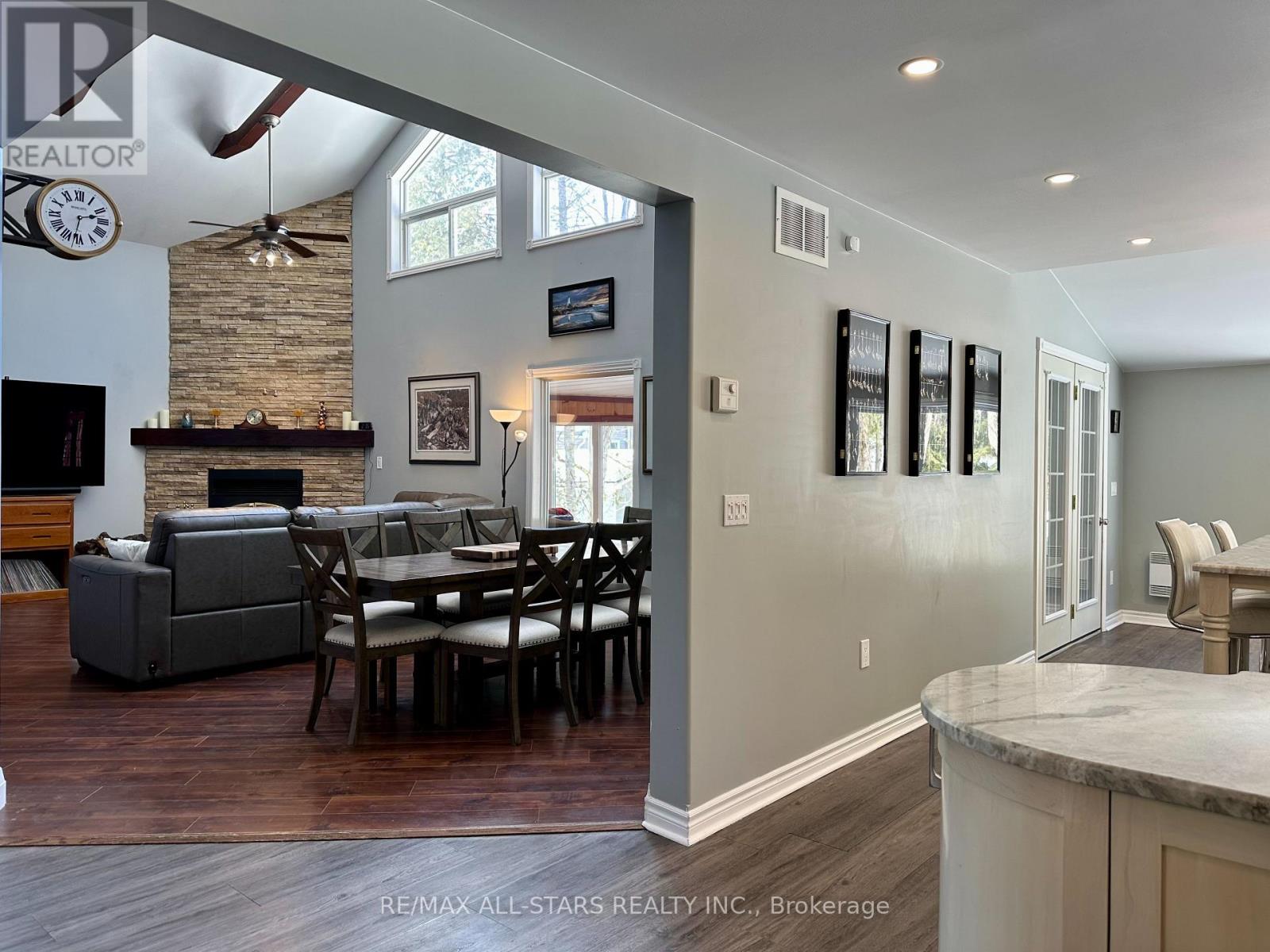 Welcome to this charming riverfront home or cottage offering 3 bedrooms and 3 bathrooms on a private riverside lot perfectly located on a year-round paved road between Bobcaygeon and Buckhorn. The home features vaulted ceilings, exposed beams, and a stunning stone wood-burning fireplace, creating a warm and inviting living space. The modern kitchen is designed for entertaining with granite countertops, stainless steel appliances, a large island with seating for four, and ample storage. A sunroom overlooking the river provides beautiful views, an infrared sauna (2025) and walkout access to the deck & newly installed hot tub (October 2025). The property includes a detached garage, metal carport and a heated bunkie behind the garage. Multiple storage options include a large shed with hydro beside the garage and another powered shed at the river's edge. Additional highlights include a steel roof, large mudroom entry, and a standing-height crawl space with stair access from the laundry room for convenient storage. Enjoy peace of mind with a 24 kW Generac generator installed January 2026. The large, flat lot offers plenty of space to enjoy waterfront living, and Oakshores Marina is just steps away with a private boat launch providing access to the Trent-Severn Waterway-making this an ideal full-time home or four-season cottage getaway. (id:61423)