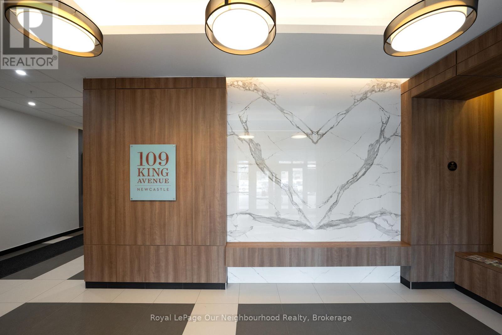$837.84 MonthlyGorgeous open concept condo with expansive windows offering panoramic views overlooking the heart of Newcastle. Spacious front foyer leads to large kitchen and living area featuring 9 1/2' ceilings. Beautiful eat in kitchen boasts center island, quartz countertops, ceramic backsplash, b/i stainless steel appliances and upgraded light fixtures. Convenient laundry room and pantry off kitchen. Additional 4pc bath off living room. Huge primary bedroom with double walk through closet, 4 pc ensuite and another outstanding view with plenty of natural light. Large 2nd bedroom could be used as an office or den. Enjoy underground parking, rooftop patio with shared barbeque and other convenient amenities. Walking distance to everything in town and close to transit and all commuter routes 401, 115 & 407. (id:61423)