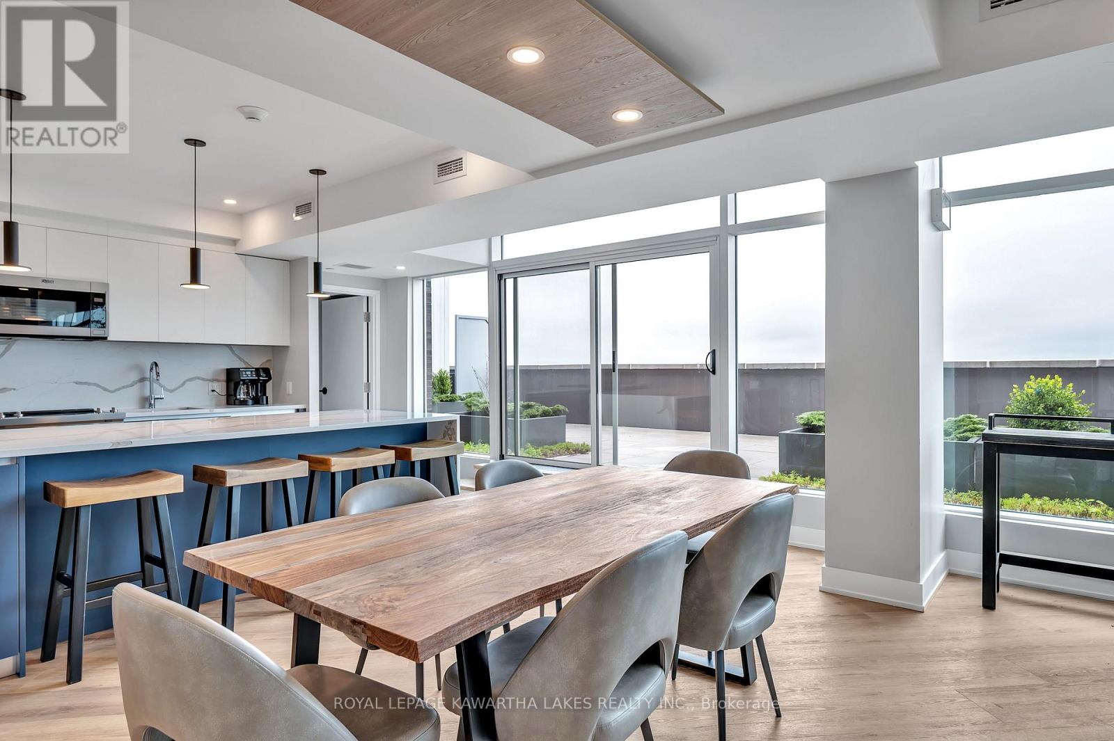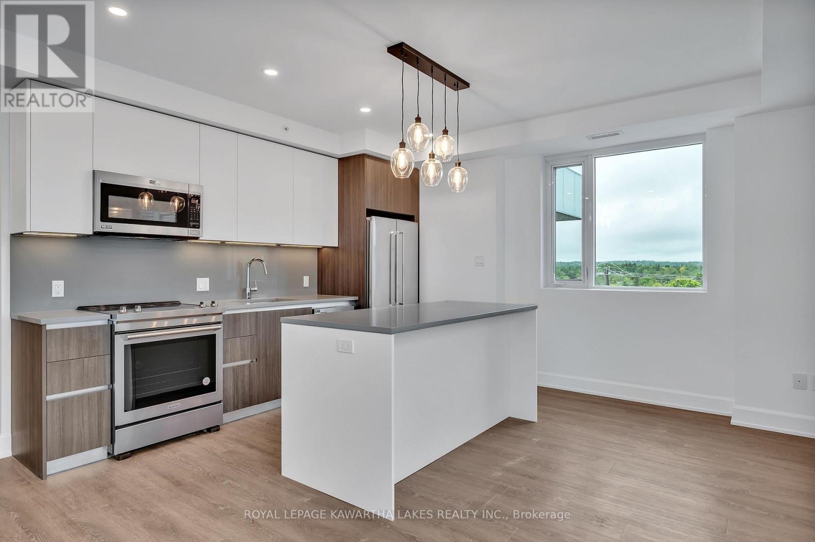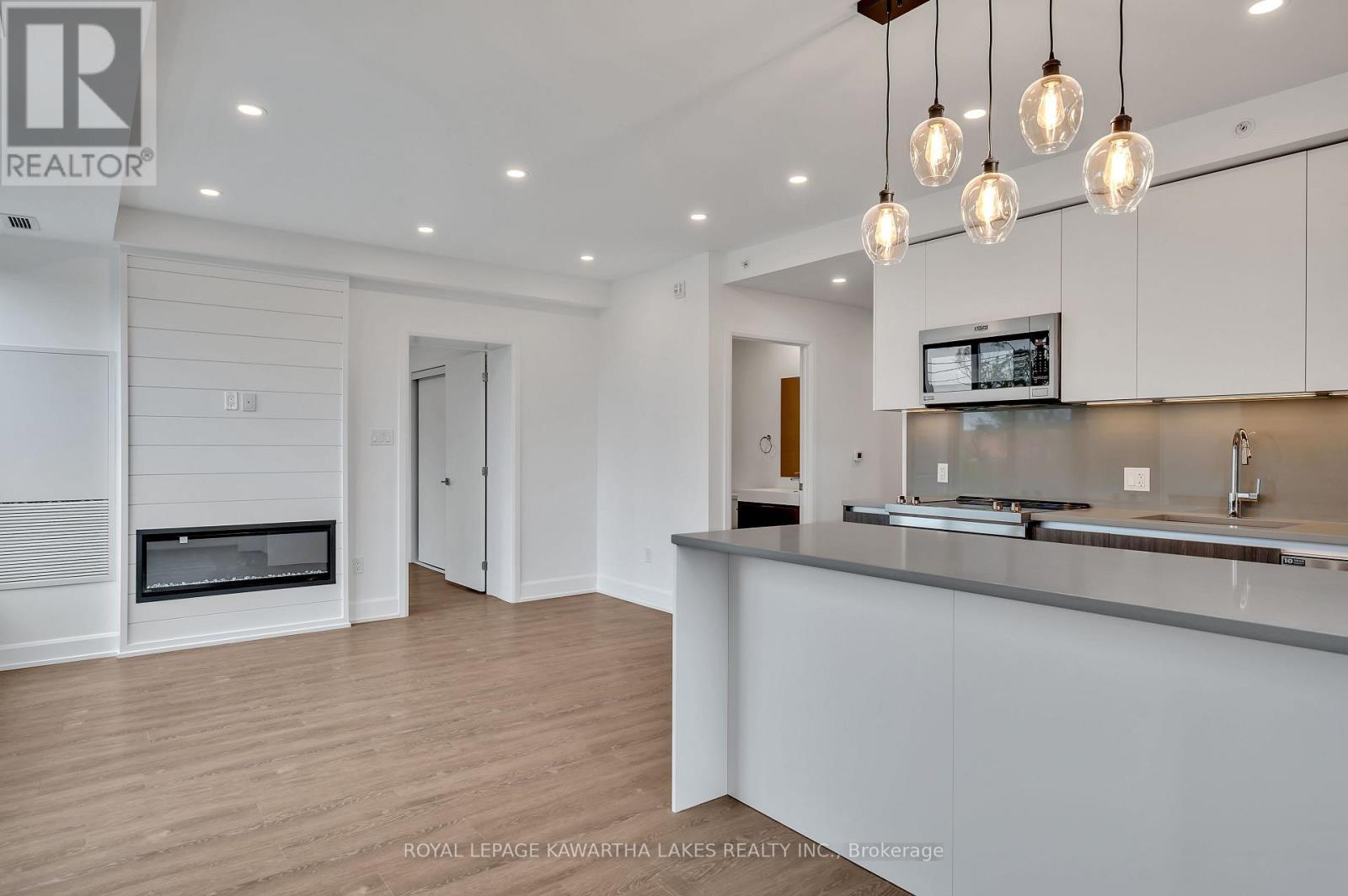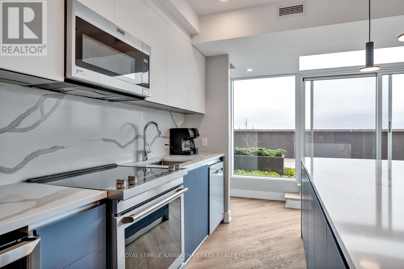 $400 MonthlyLuxury Living in the Heart of Peterborough. Discover elevated condo living in this brand-new, stylish residence offering an open-concept layout with 9-foot ceilings and Gas Fireplace. The chef-inspired kitchen features an oversized island, quartz countertops, built-in stainless steel appliances, and custom cabinetry, perfect for cooking and entertaining. This modern condo includes 2 spacious bedrooms and 2 sleek bathrooms, designed for comfort and style. Designer upgrades are found throughout, creating a refined living experience. Enjoy top-tier amenities, including a contemporary lobby, 8th-floor lounge and party room with a two-sided fireplace, a private dining area that opens to a stunning rooftop terrace with panoramic views of the city. Stay active in the fully equipped fitness centre and take advantage of the on-site pet washing station. Ideally located in East City, you're steps from shops, cafes, bakeries, parks, and Rogers Cove Beach. Includes underground parking space P2-19 for added convenience. Move into Peterborough's most luxurious and vibrant condo community, where modern design meets unmatched lifestyle. Note - Heating costs are included in monthly condo fees. (id:61423)