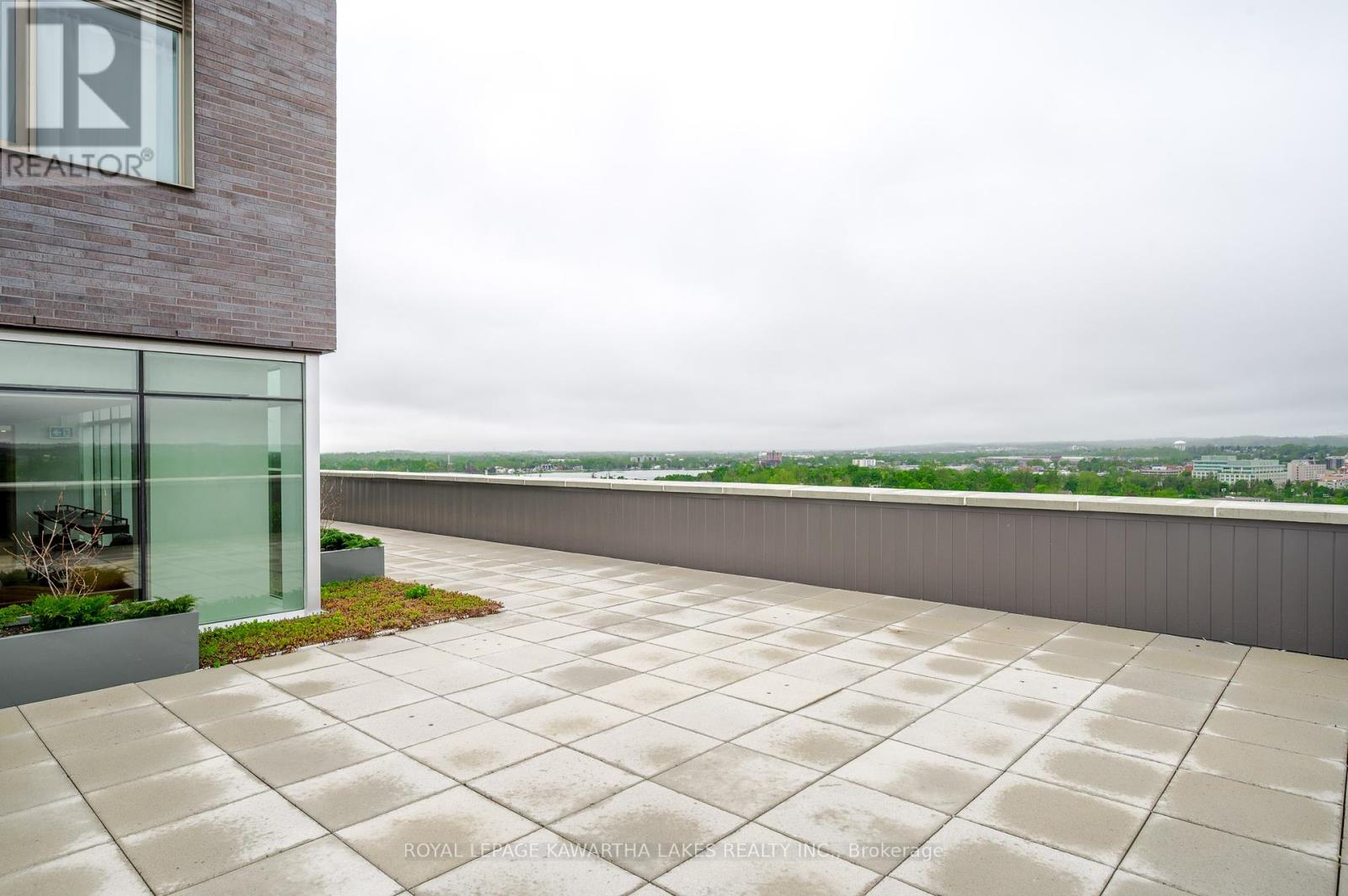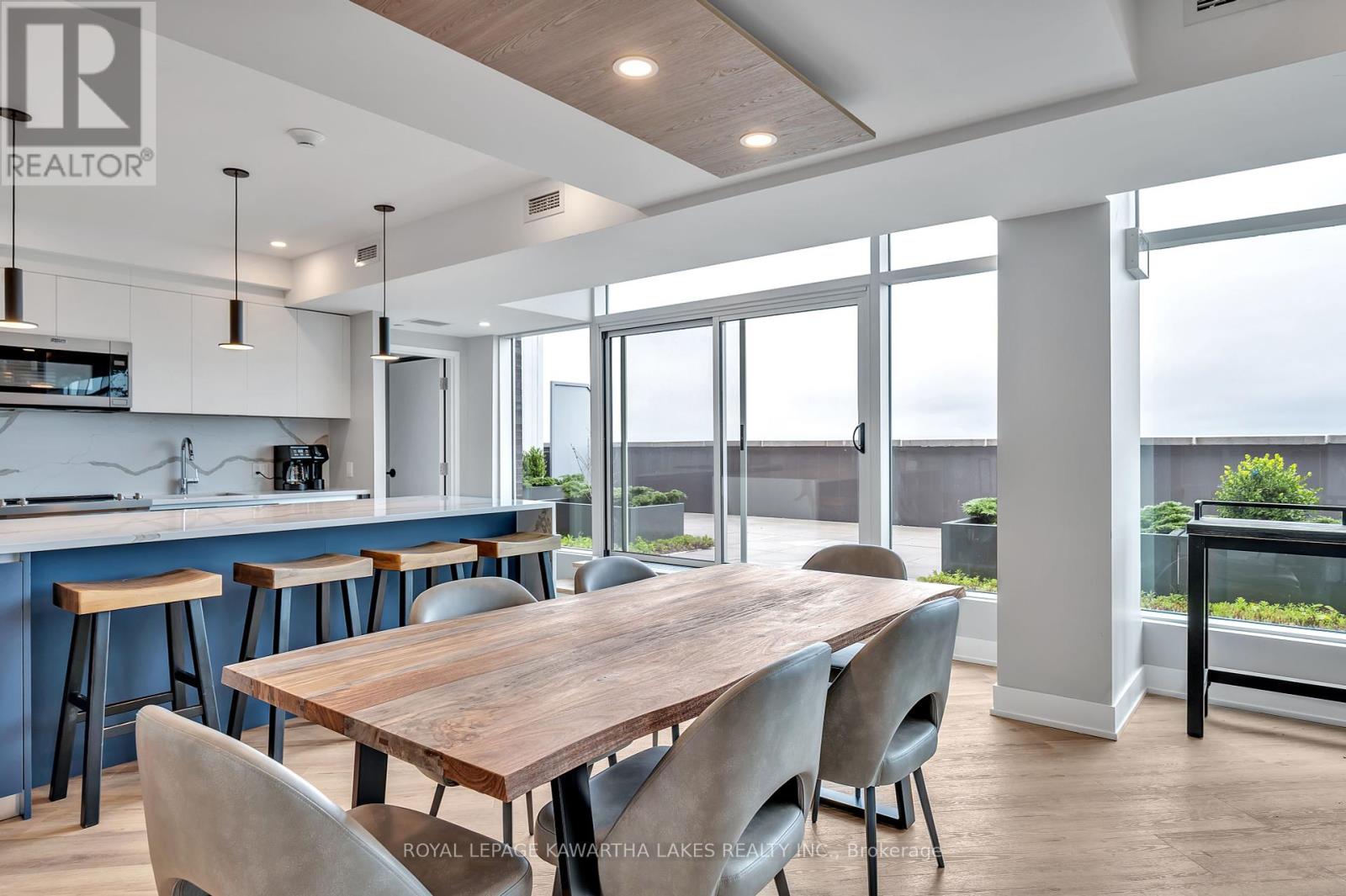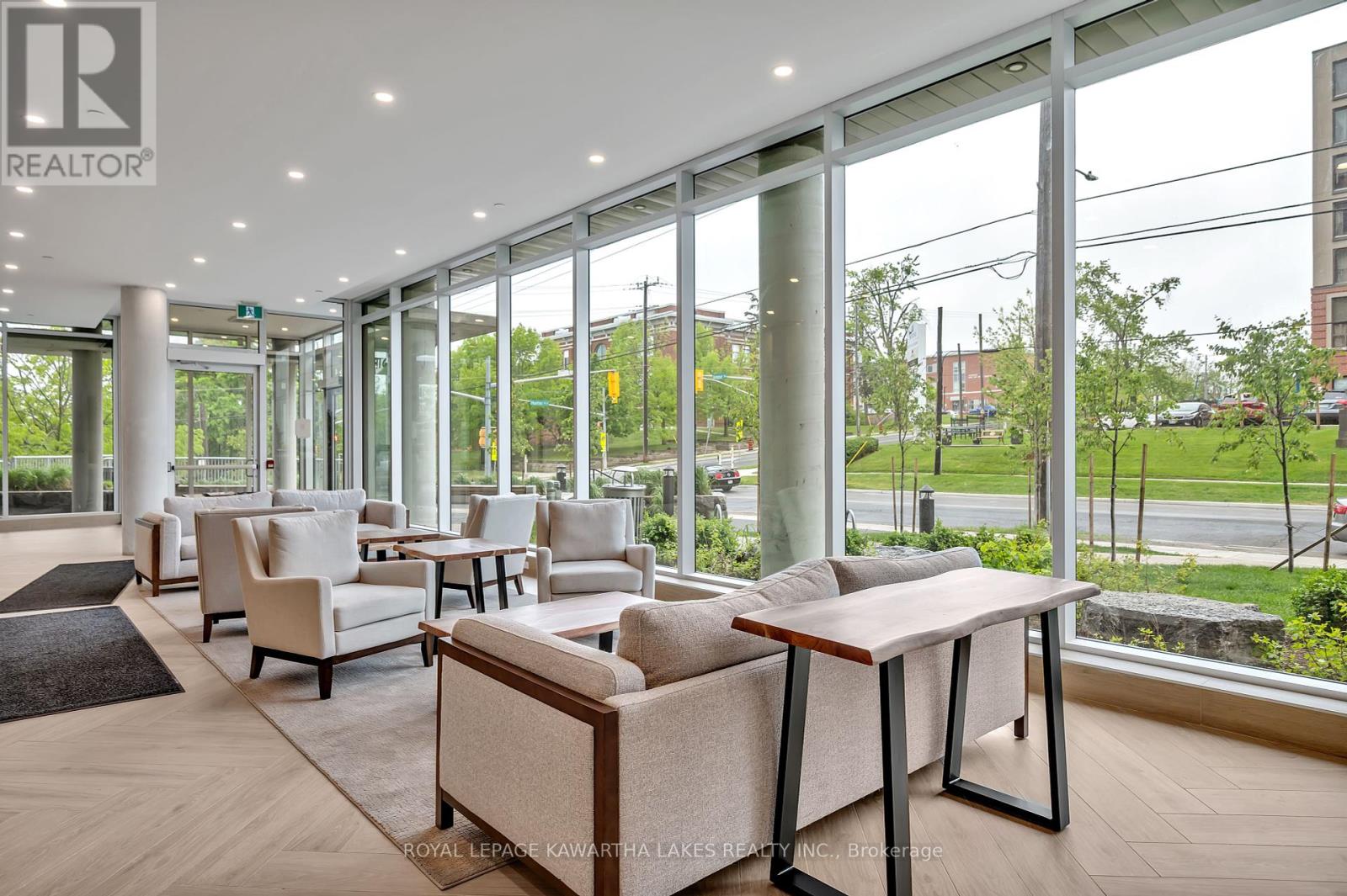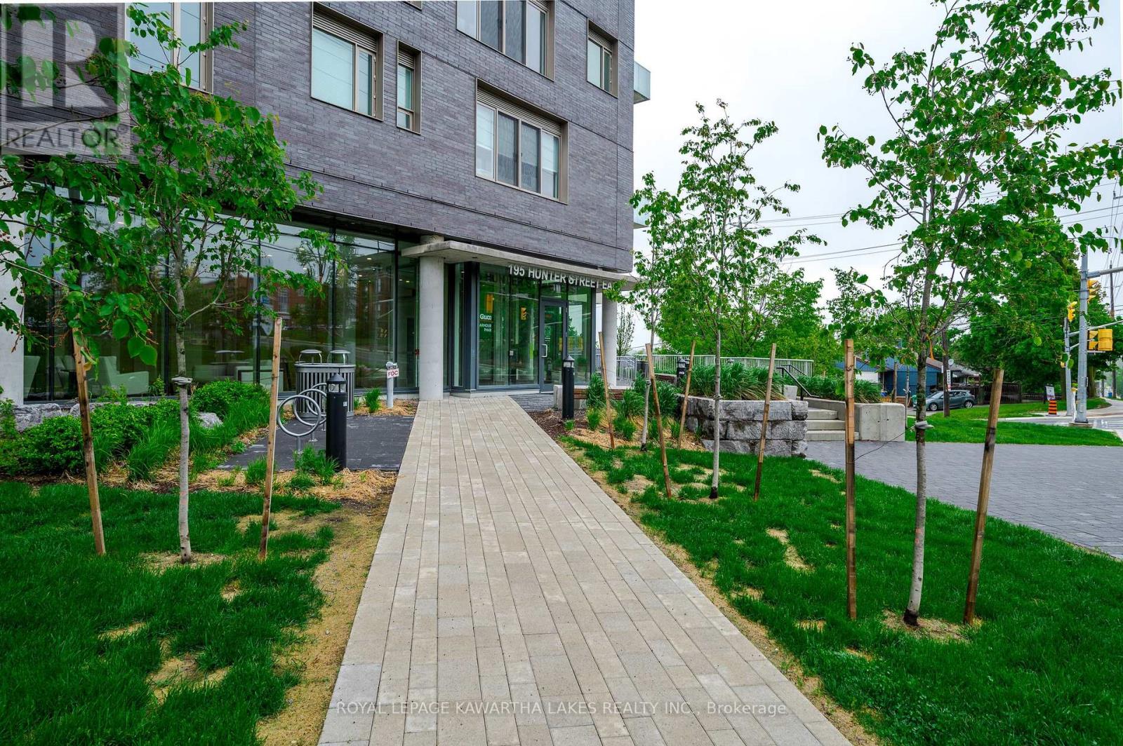 $400 MonthlyLuxury Living in the Heart of Peterborough. Discover elevated condo living in this brand-new, stylish residence offering an open-concept layout with 9-foot ceilings and gleaming hardwood floors. The chef-inspired kitchen features an oversized island, quartz countertops, built-in stainless steel appliances, and custom cabinetry, perfect for cooking and entertaining. This modern condo includes 2 spacious bedrooms and 2 sleek bathrooms, designed for comfort and style. Designer upgrades are found throughout, creating a refined living experience. Enjoy top-tier amenities, including a contemporary lobby, 8th-floor lounge and party room with a two-sided fireplace, and a private dining area that opens to a stunning rooftop terrace with panoramic views of the city. Stay active in the fully equipped fitness centre and take advantage of the on-site pet washing station. Ideally located in East City, you're steps from shops, cafes, bakeries, parks, and Rogers Cove Beach. Includes underground parking space P2-19 for added convenience. Move into Peterborough's most luxurious and vibrant condo community, where modern design meets unmatched lifestyle. (id:61423)