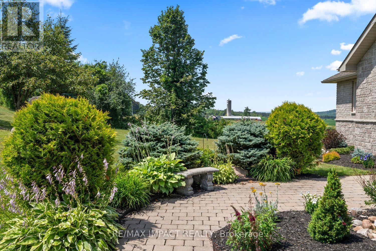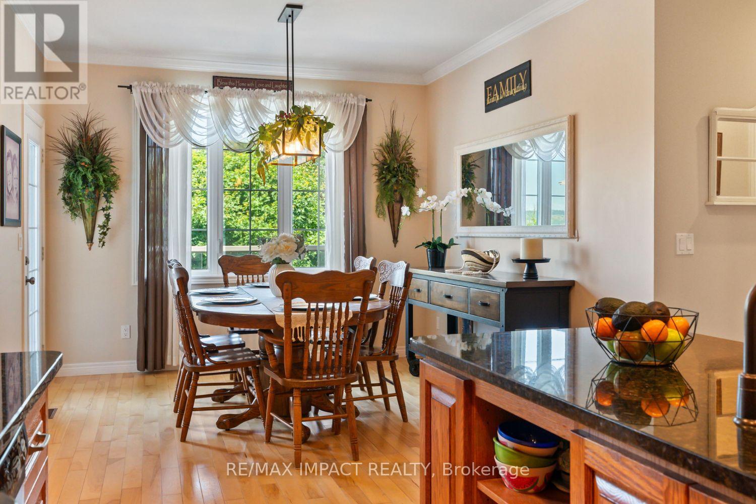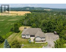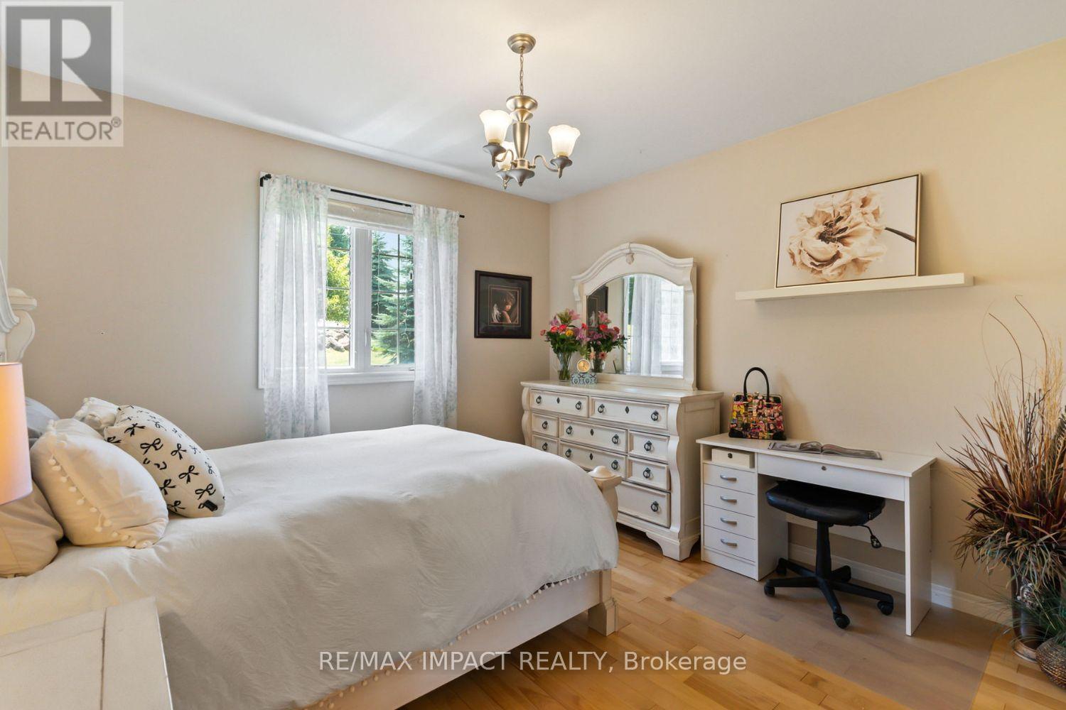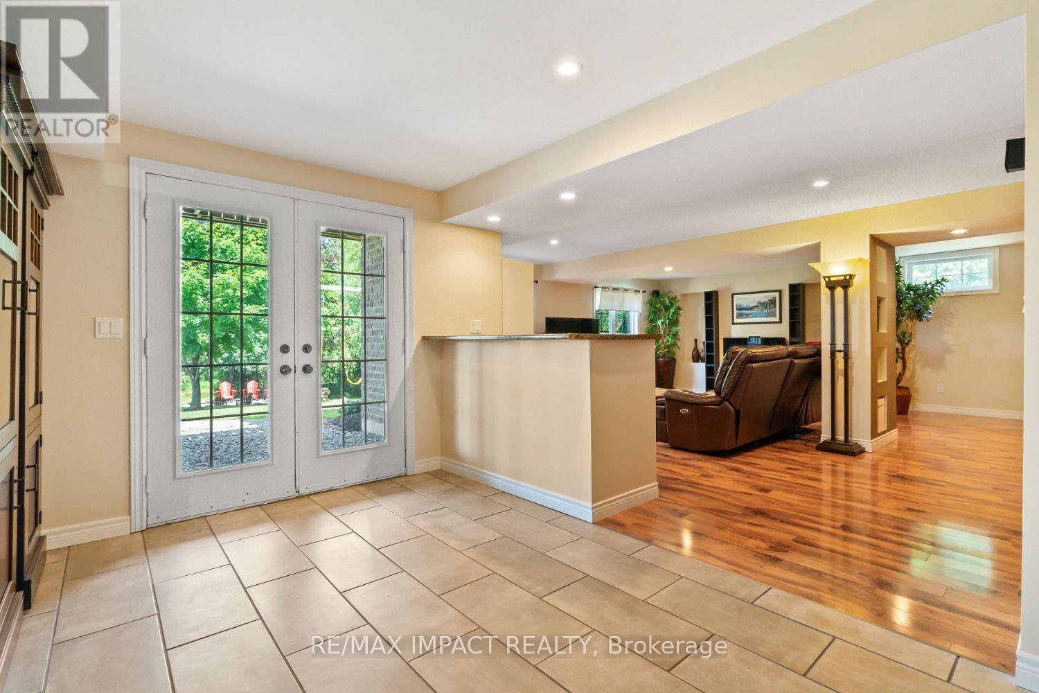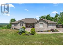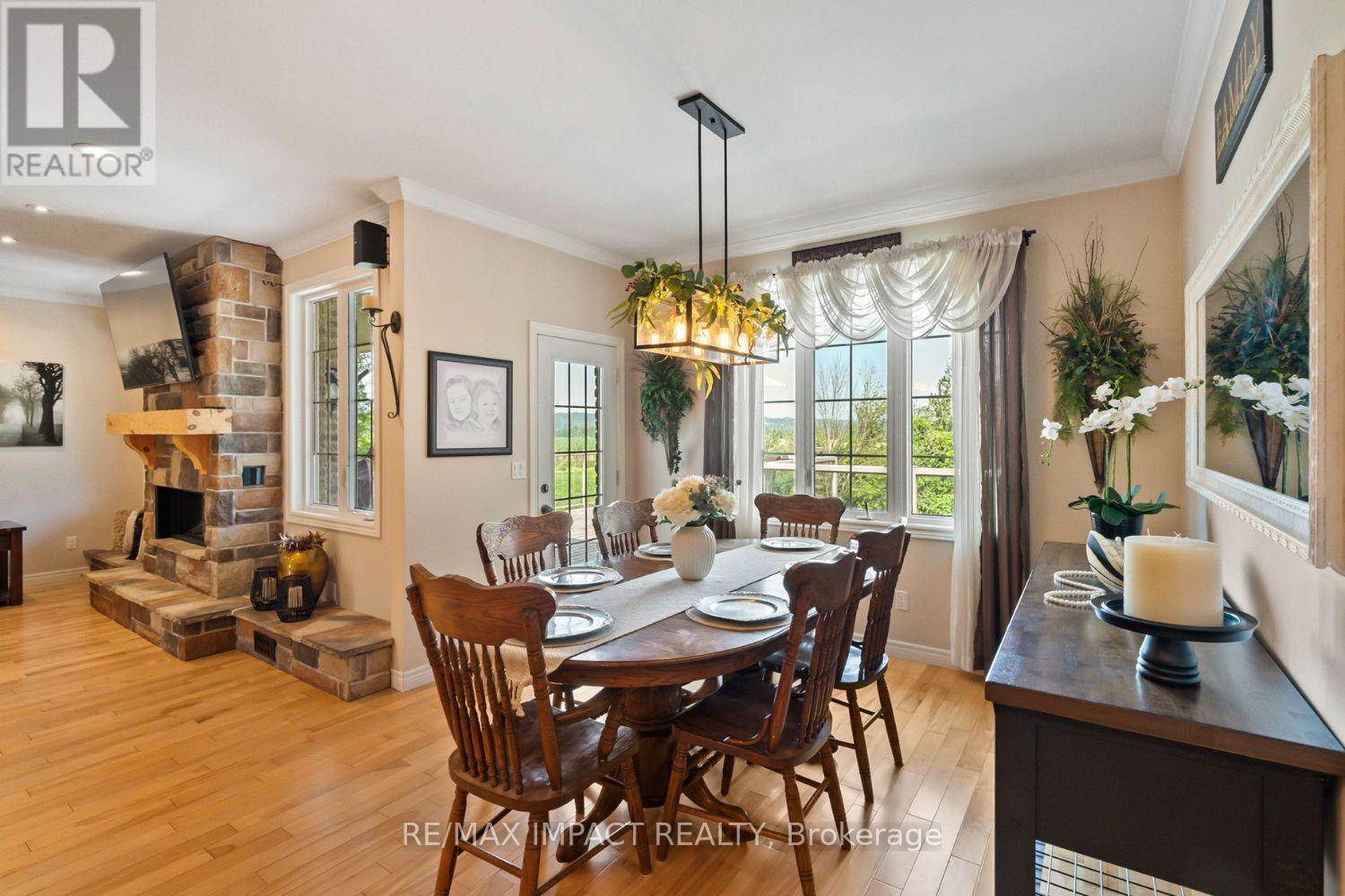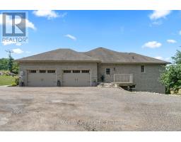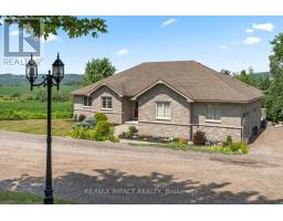 Impressive custom brick/stone bungalow, boasting over 2500 sf of luxurious living space on the main level plus full WALKOUT basement and attached heated 3-car garage with 2 overhead doors. Nestled on an expansive 1.74 ACRES, this home offers a serene lifestyle with panoramic views overlooking farmlands and the Cavan Hills, complete with a spring-fed POND, ranging from 10-14 ft deep. As you enter the front foyer, there is a convenient den plus the grandeur of a spacious great room, accentuated by a striking stone fireplace and a unique waffle-patterned feature wall. Gleaming hardwood floors flow throughout the home with an abundance of crown mouldings and pot lights. The chef's kitchen is a culinary delight, equipped with stainless steel appliances, a granite countertop, ceramic backsplash, and an island with a veggie sink. The adjacent large dining area opens onto a generous deck, designed with tempered regal glass for unobstructed views of the backyard and fire pit area, ideal for entertaining friends and family. The main floor features 4 well-appointed bedrooms, including a primary suite that includes a walkout to the deck, a luxurious 5-pc ensuite with dual sinks, a separate shower and a whirlpool tub, all complemented by a stylish barn door privacy feature. The primary suite also boasts a walk-in closet with built-in shelving for optimal organization. Two of the additional bedrooms share a convenient Jack and Jill bathroom, while a third bedroom is situated near the 2-pc powder room. The walkout basement includes large above-grade windows that flood the space with natural light, a cozy family room complete with an electric infinity fireplace and a dry bar, 3-pc washroom and a huge open area with extra plumbing rough-ins, perfect for customization. The basement also features ample storage, making it an excellent option for a multi-generational living arrangement with its separate entrances and walkout basement. (id:61423)