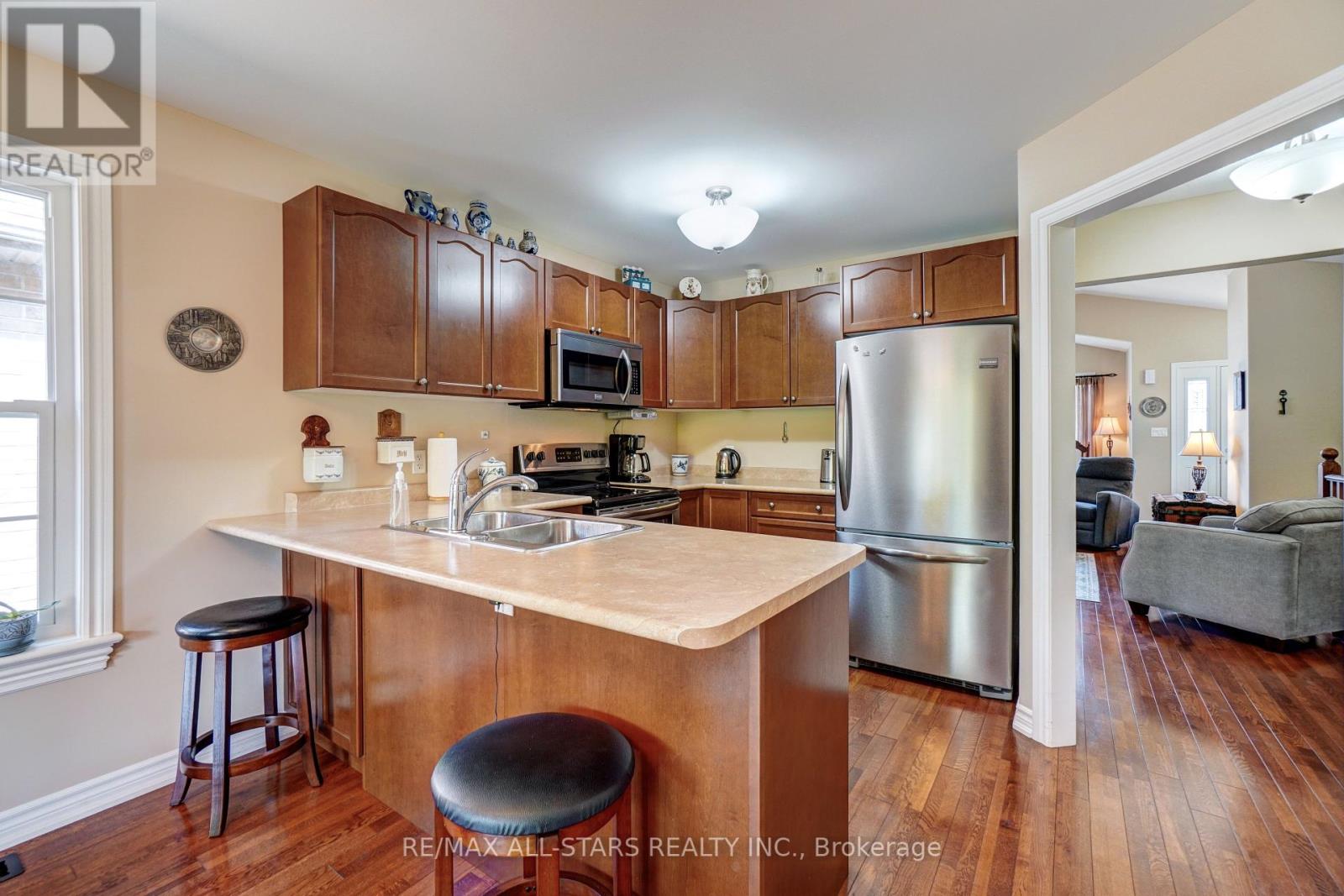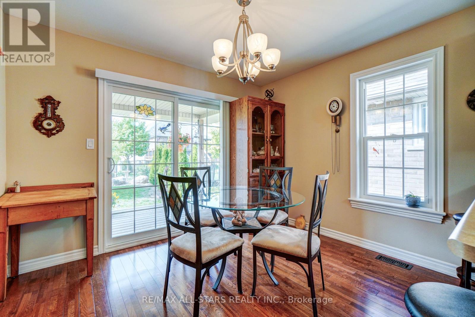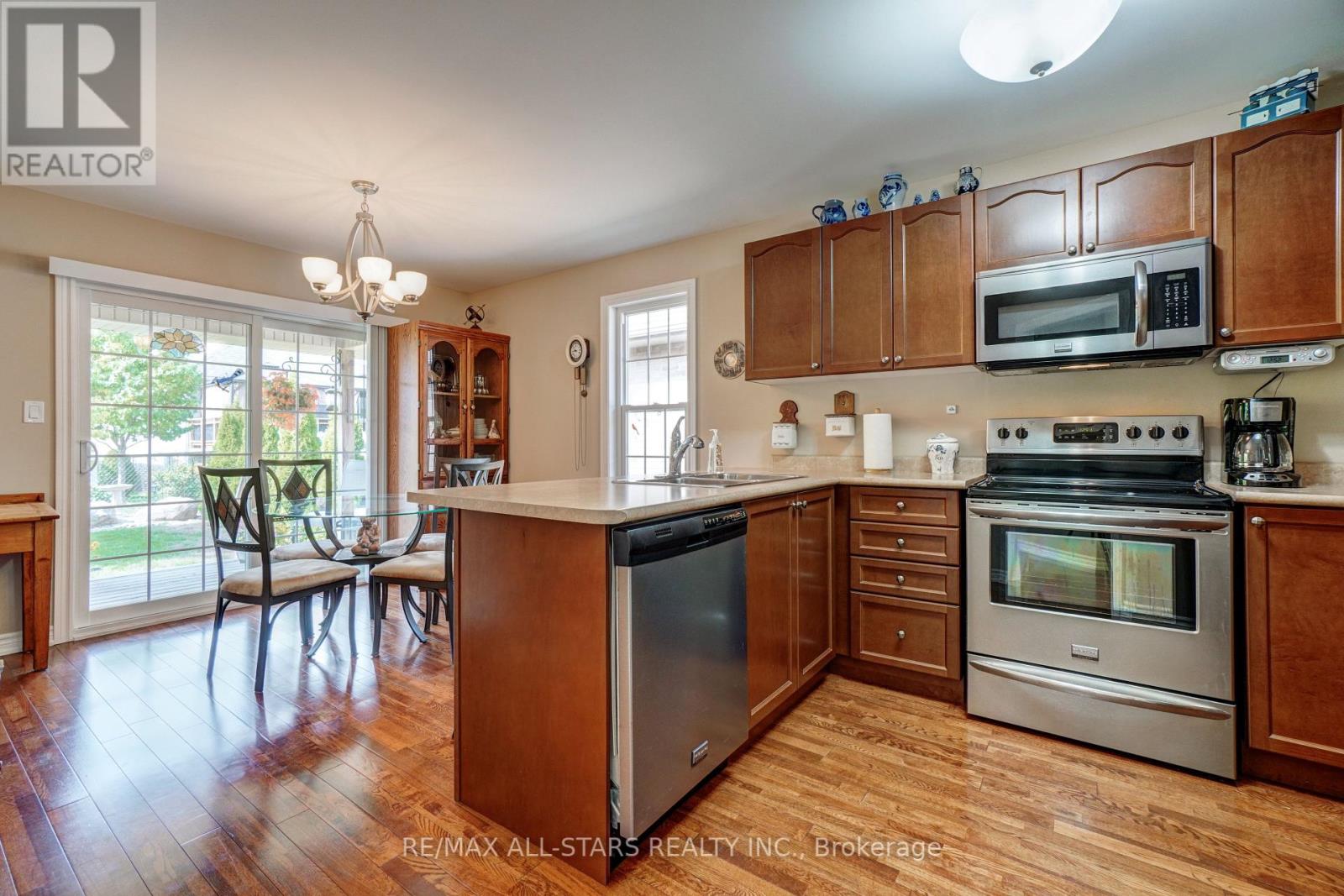 Excellent, well-built, all-brick 2 bed, 2 bath bungalow (plus a lower level bed/office/den) and main floor laundry, Ensuite bathroom and gleaming hardwood floors under cathedral ceilings. Eat-in Kitchen with pots & pans drawers & breakfast bar & appliances is highly serviceable and impeccable. Walk-in from oversize single garage to home. Walk-out from the kitchen/dining to Covered back deck & partially fenced backyard. (id:61423)