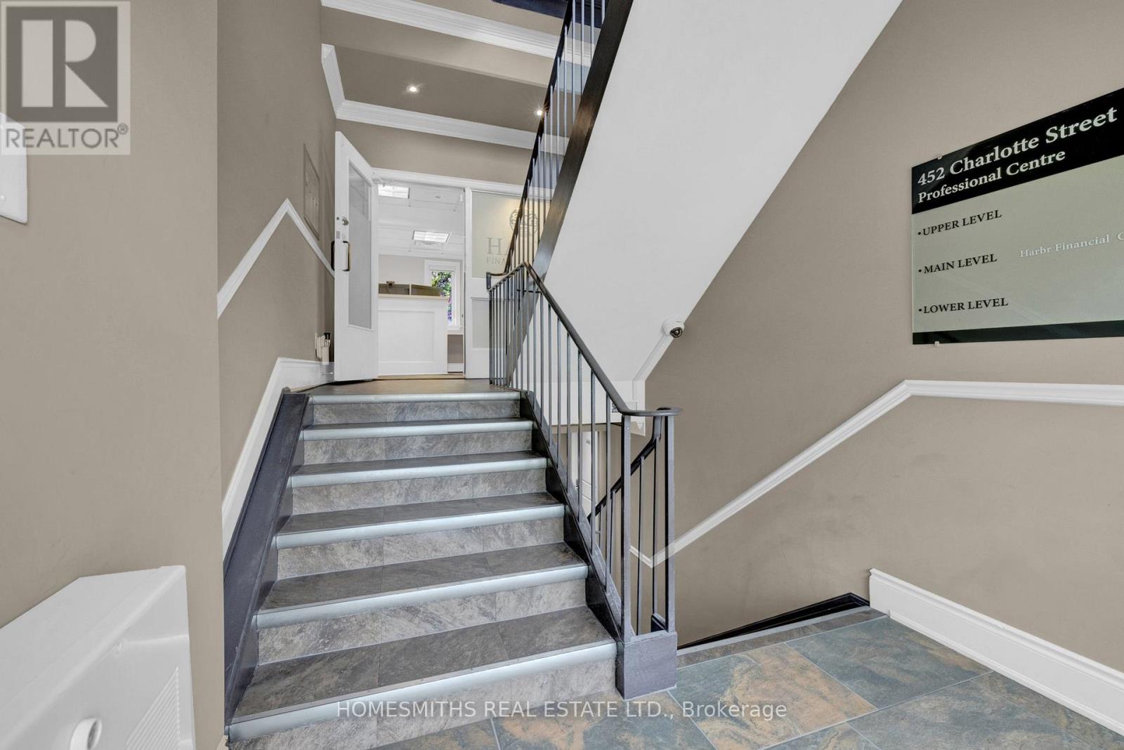 This landmark, stand alone, office building situated on a high visibility corner of downtown Peterborough offers a rare opportunity for end user or multi tenant investment with 3 newly renovated floors of office space. 452 Charlotte makes a bold statement from the street with its traditional architecture, inviting landscaping and invaluable 20 parking spaces. Beautifully restored and maintained with high ceilings and several large windows that flood the space with natural light. Strategically laid out for optimal professional or service based businesses with private offices, open/group work centers, board rooms, lunch/break rooms and a bright open reception area. The building would make an excellent dental clinic with space for multiple operatories and separate floors for specialists; general dentistry, orthodontics, periodontics, prosthodontics etc. Each floor has designated HVAC to allow for zoned heating and cooling. Large unfinished upper loft offers potential for future finished space, data/file storage etc. Excellent addition to any real estate portfolio. Assume the existing tenant or purchase vacant for single/end user or multi tenant. See virtual tour. (id:61423)