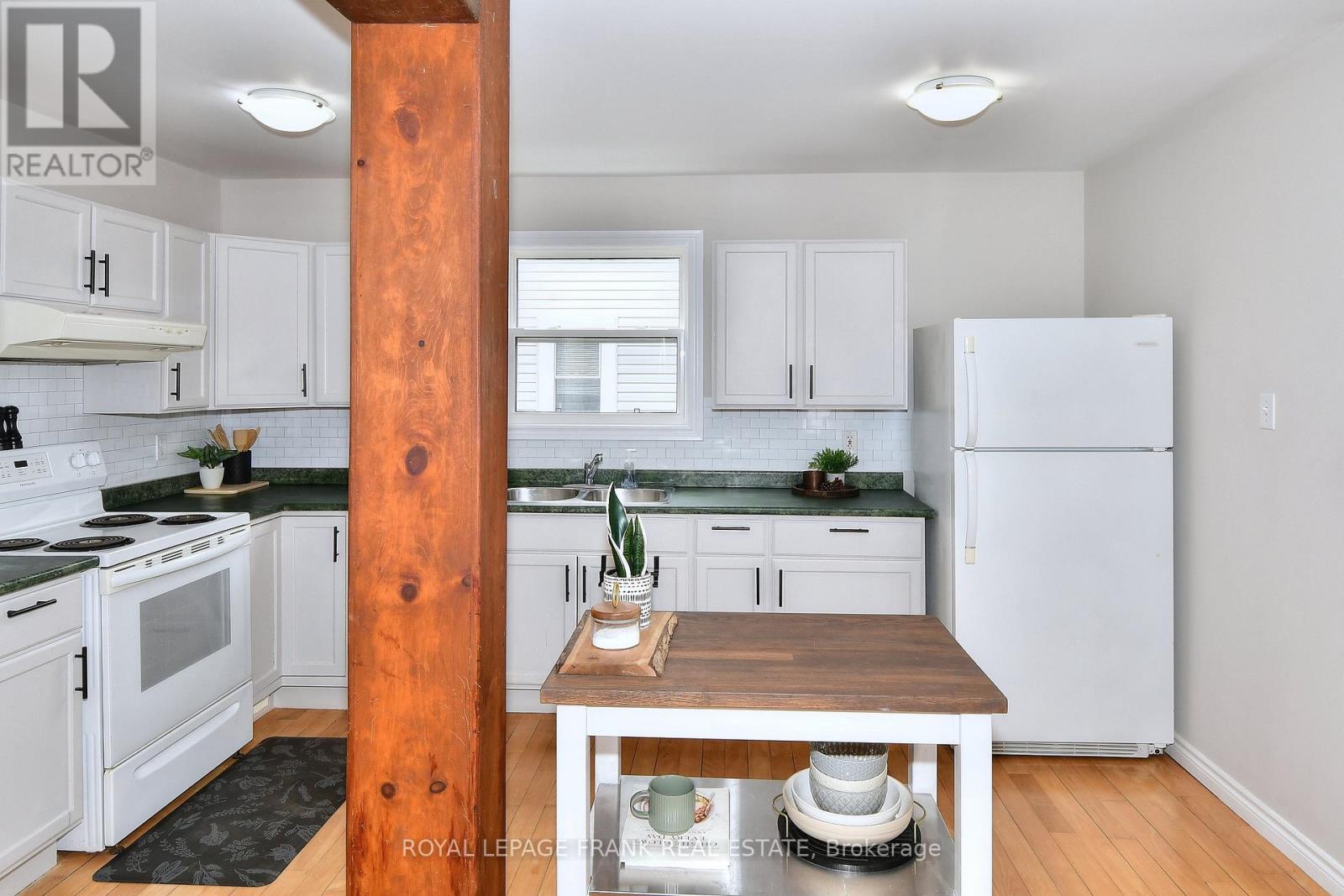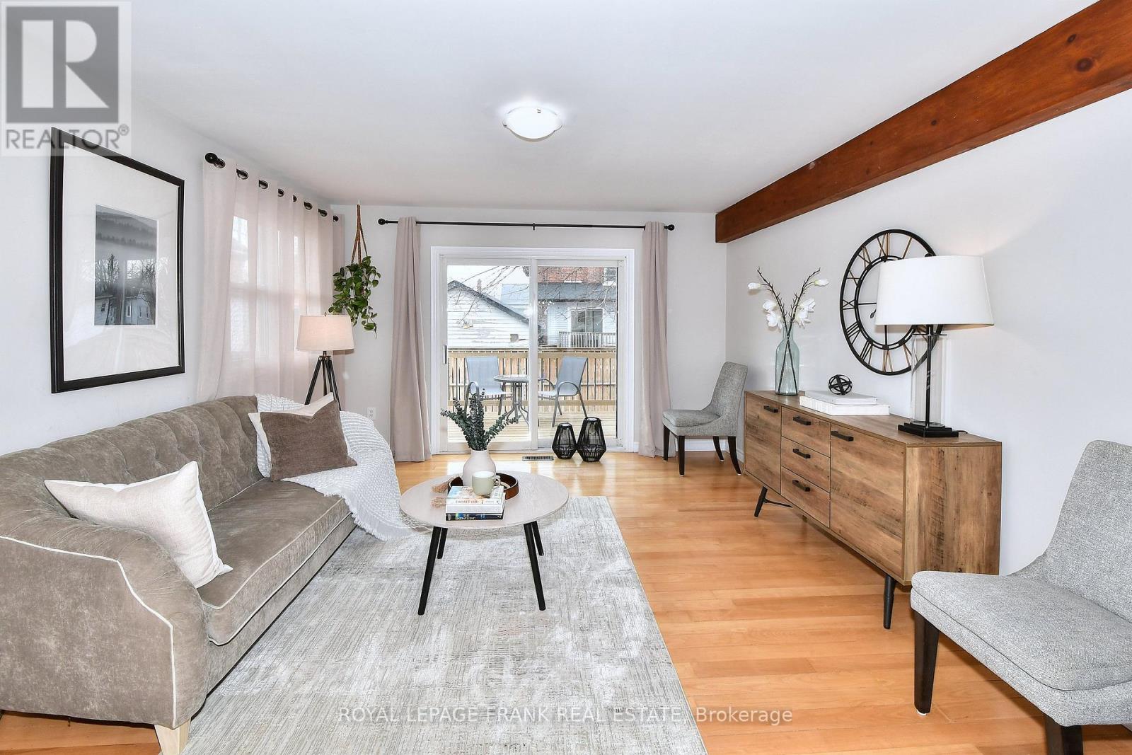 Beautiful Peterborough Home on a Double Lot with Detached 2-Car Garage! Welcome to this charming 3-bedroom, 2 bathroom, 1 1/2 storey home located in Peterborough's desirable. Situated on a double lot with detached 2-car garage (23'6" x 21'5") with hydro, this property offers space, comfort and convenience. Inside you'll love the bright open-concept layout featuring a spacious kitchen and dining area that flows into a open sitting area and living room with a sliding door leading to the rear deck and partially fenced backyard-perfect for relaxing and entertaining. The main floor also includes an attractive 4-piece bath and a large primary bedroom. Upstairs, you'll find two additional bedrooms, ideal for family, guests, or office space. The lower level features a 3-piece bath with shower, laundry area, (if you add flooring it would complete a recreation room) large unfinished area that has a walk up staircase to the backyard-plus great potential to finish basement and add your personal touch. Enjoy low natural gas heating costs, central air conditioning, and mainly wood flooring throughout. Located within walking distance to the farmers market, sports centre, trails, entertainment, river and nearby park, with easy access to Highway 115, and only minutes from shopping, restaurants, health facilities, schools, churches, golf and the library. Public transit is conveniently located at the end of the street. In 2003, this home was gutted to frame, all new wiring, plumbing, insulation, drywall, windows, doors, trim, cabinetry, electrical fixtures, new Styrofoam sheeting and vinyl siding. This lovely home, finished in neutral tones, is move-in ready and an absolute joy to view. (id:61423)