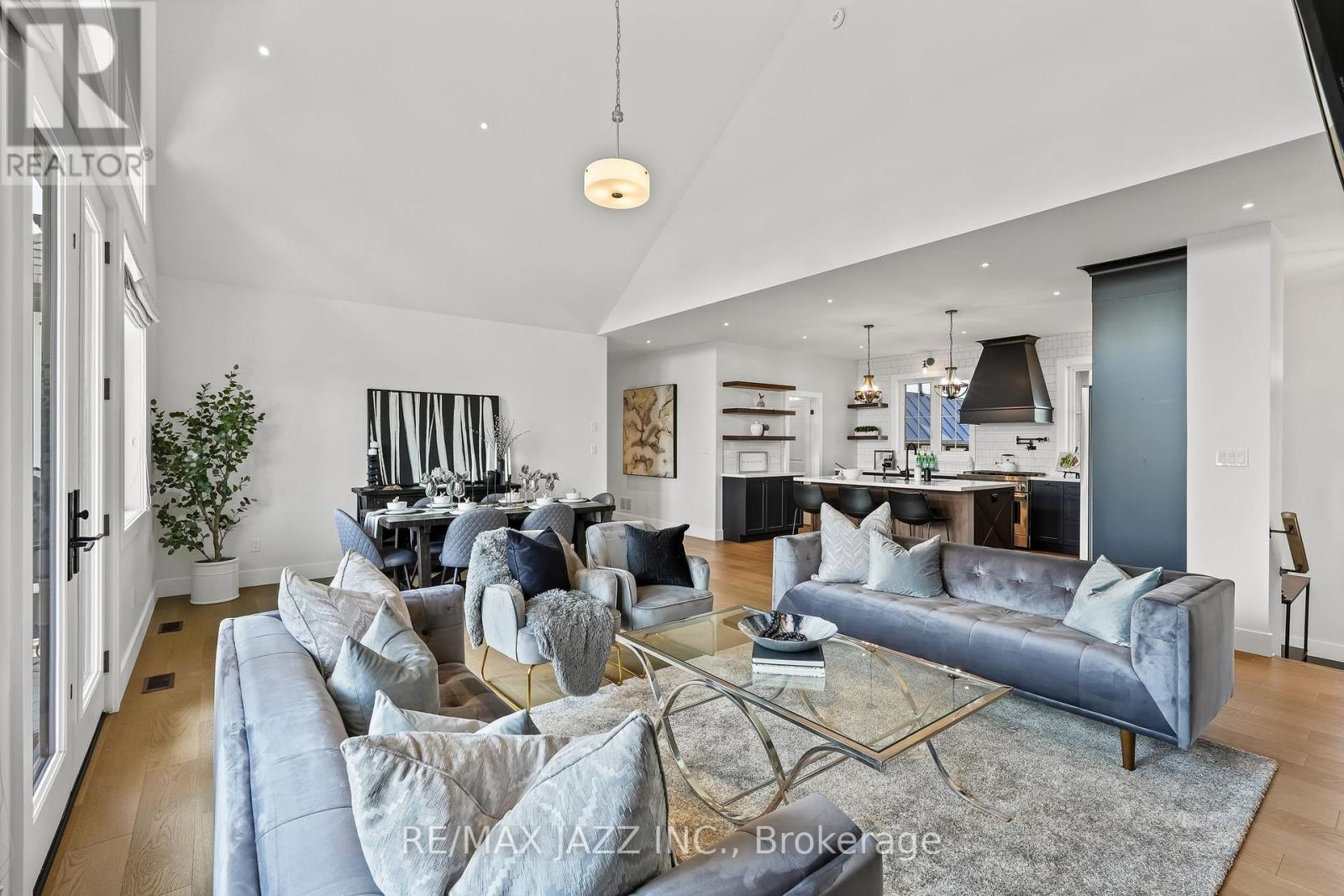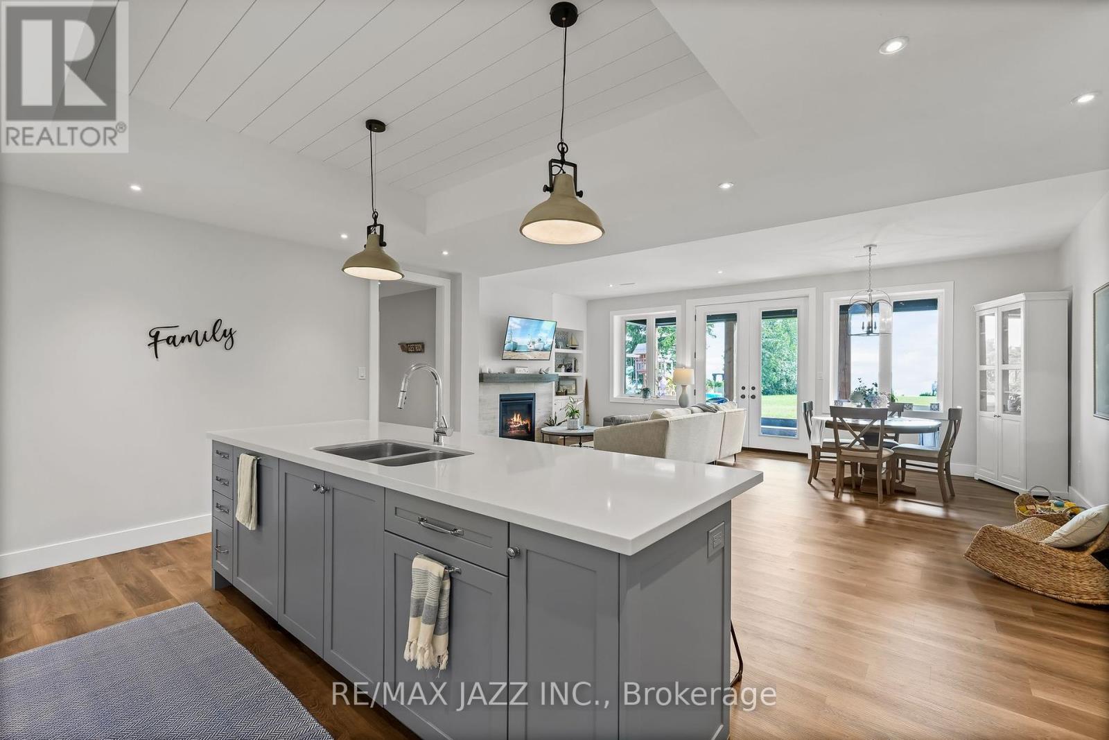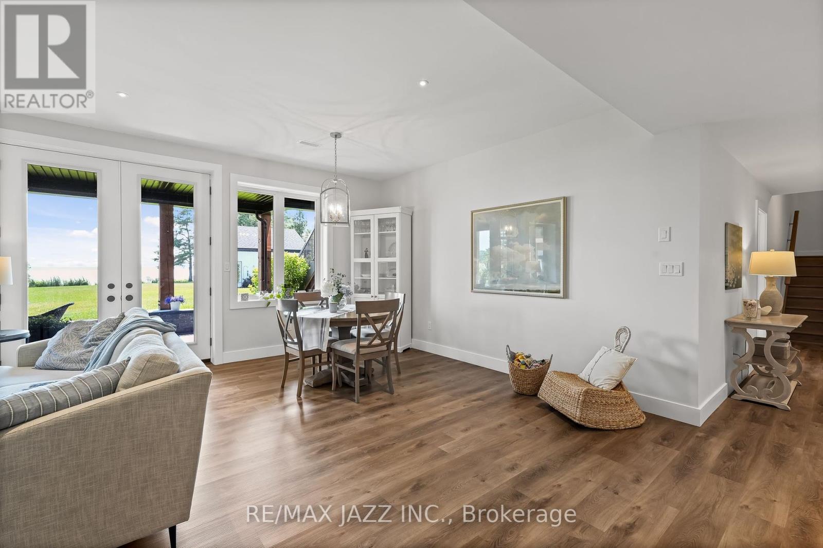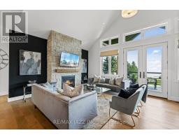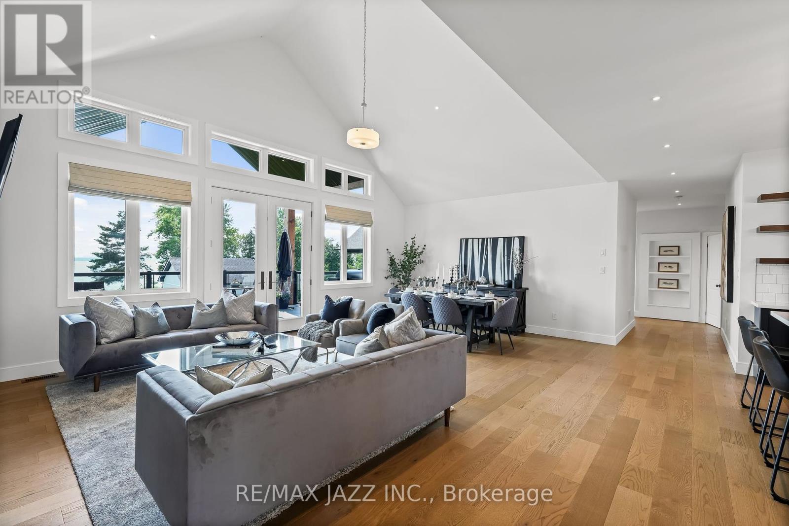 Experience exceptional lakeside living in this stunning Jeffery-built home on a 89 x 376 ft lot with serene, south-facing views of Lake Scugog. From the moment you enter through the oversized front door, the quality and craftsmanship are undeniable. The open-concept main living space impresses with hardwood floors, soaring cathedral ceilings and full-height stone fireplace. Oversized windows and double French doors fill the space with natural light and open to a covered deck with sweeping water views. The kitchen is a chef's dream, with oversized centre island, 36" dual-fuel range, custom hood vent, pot filler, undercabinet lighting and walk-in pantry. Perfect for everyday living and entertaining. The private primary suite offers tranquil lake views, custom walk-through closet and gorgeous 5-pc ensuite with heated floors, double vanity and glass shower with dual shower heads. A separate wing includes two spacious bedrooms with double closets and shared Jack-and-Jill bath. Massive main floor laundry with extra cabinetry and double closets provides direct access to the impressive 900 sq ft garage with epoxy floors, soaring ceilings and separate staircase to the lower level. A stylish 2-pc powder room completes the main floor. Hidden behind a custom bookshelf, a 900 sq ft loft offers the ultimate bonus space. Complete with projector, screen and durable flooring, this fabulous space is an entertainer's dream. The fully finished basement features a second kitchen, open-concept living space with fireplace and walk-out to a sunken covered patio, additional primary suite with walk-in closet and 3-pc ensuite, second bedroom and another 3-pc bath. A second laundry room and ample storage complete this level. Outside, you'll find an incredible multi-purpose pavilion with French doors and sliding walk-out on the lake side; it's ideal as a party/games room, cabana, or simply as extra storage for your toys. This extraordinary home showcases luxury living at its finest! (id:61423)