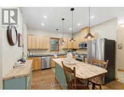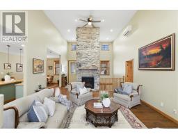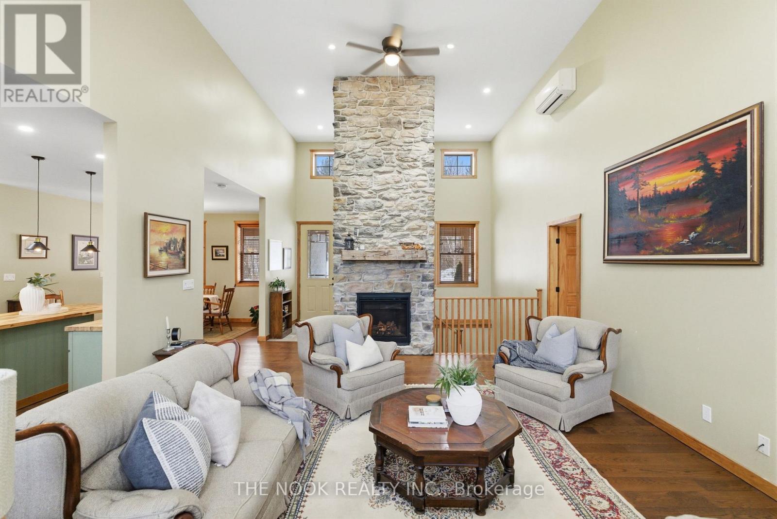 Set on just over half an acre in a quiet lakeside neighbourhood, this exceptional 4-year-old home offers stunning views of Rice Lake and an unparalleled indoor/outdoor lifestyle. A public dock and boat launch are conveniently located within 200 metres, making this an ideal property for boating and lake enthusiasts.Designed with a unique, sun-filled open-concept layout, the home offers approximately 2,400 sq ft of finished living space with 9' ceilings throughout and a dramatic 15' vaulted ceiling on the main floor. At the heart of the home is a massive central stone fireplace, complemented by a propane fireplace on the main level and a wood-burning fireplace in the lower level, creating warmth and character year-round.The main floor features a spacious primary bedroom with a private covered porch, a beautifully appointed ensuite, main floor laundry, and abundant storage and closet space. The finished walk out lower level offers two large bedrooms, a full bath, and additional living space ideal for family or guests. Hardwood and ceramic flooring flow throughout the home, adding timeless style and durability.Built for comfort and efficiency, the home boasts super-insulated walls and ceilings, in-floor hydronic heating on all levels, and a propane boiler providing both heat and hot water. Three mini-split units offer supplemental heating and air conditioning.Car, hobby, and recreational enthusiasts will appreciate the oversized four-car over/under garage, complete with a 9,000 lb Atlas two-post hoist, in-floor heat in the lower garage, propane radiant heat in the upper garage, air compressor plumbing on both levels, welder plug, RV hookups, and extensive storage for cars, boats, and campers.With covered front and rear porches, breathtaking lake views, and thoughtfully designed spaces throughout, this remarkable property offers comfort, functionality, and a lifestyle rarely found. (id:61423)