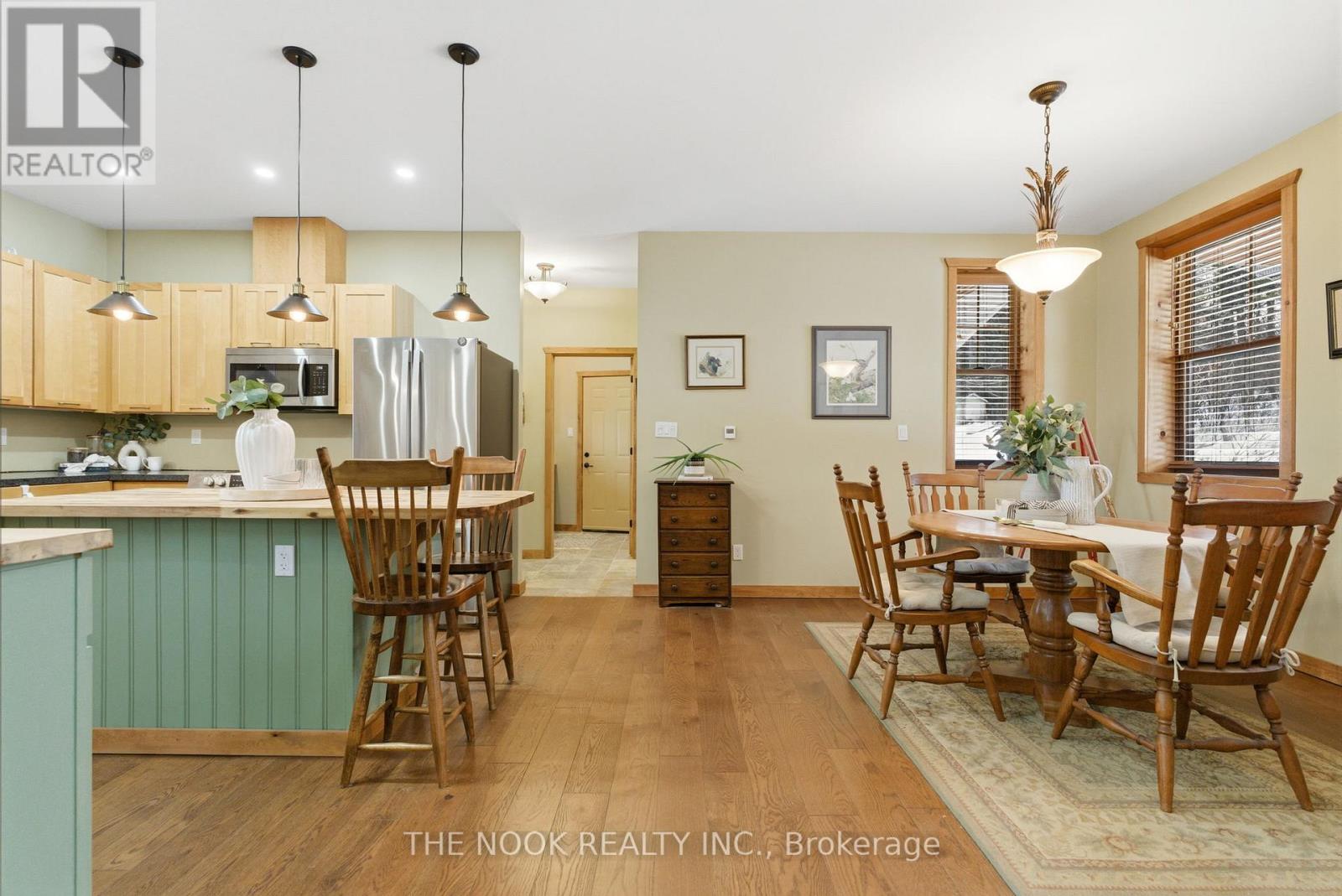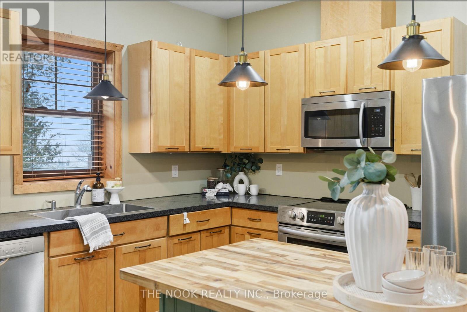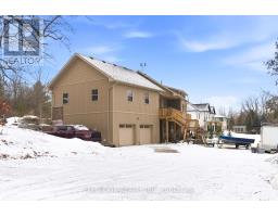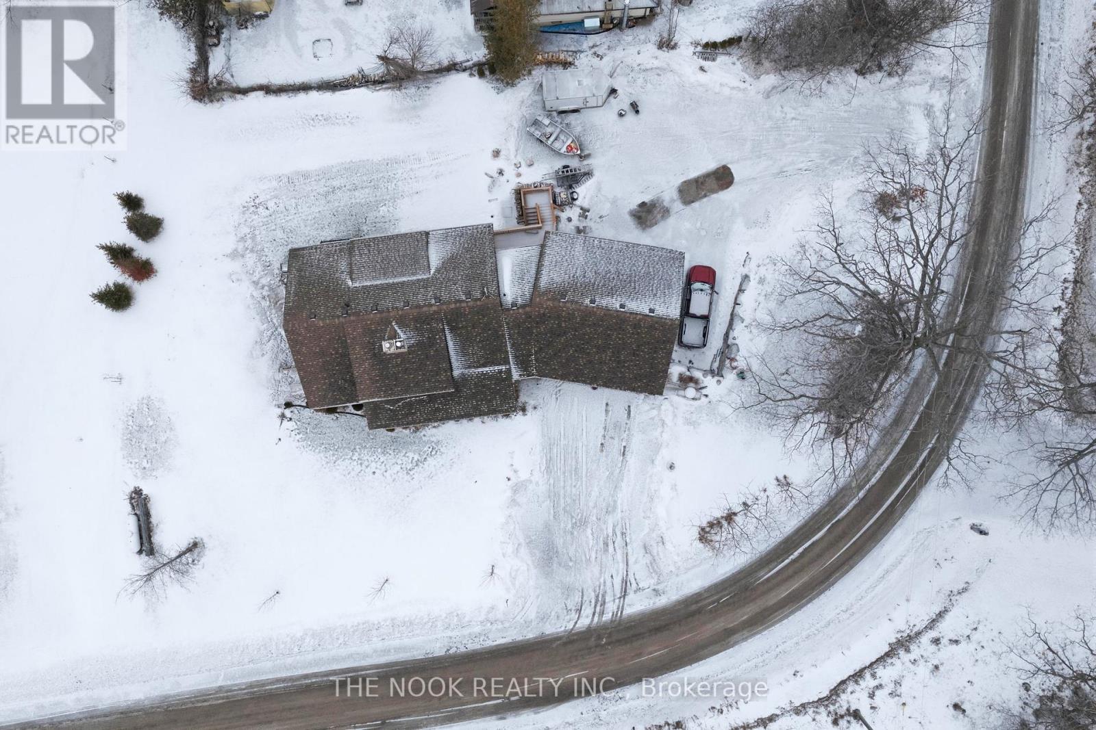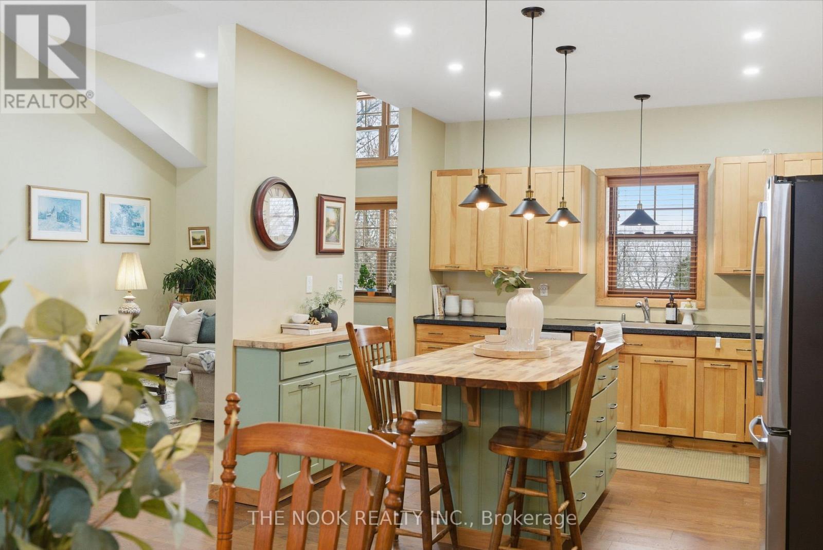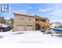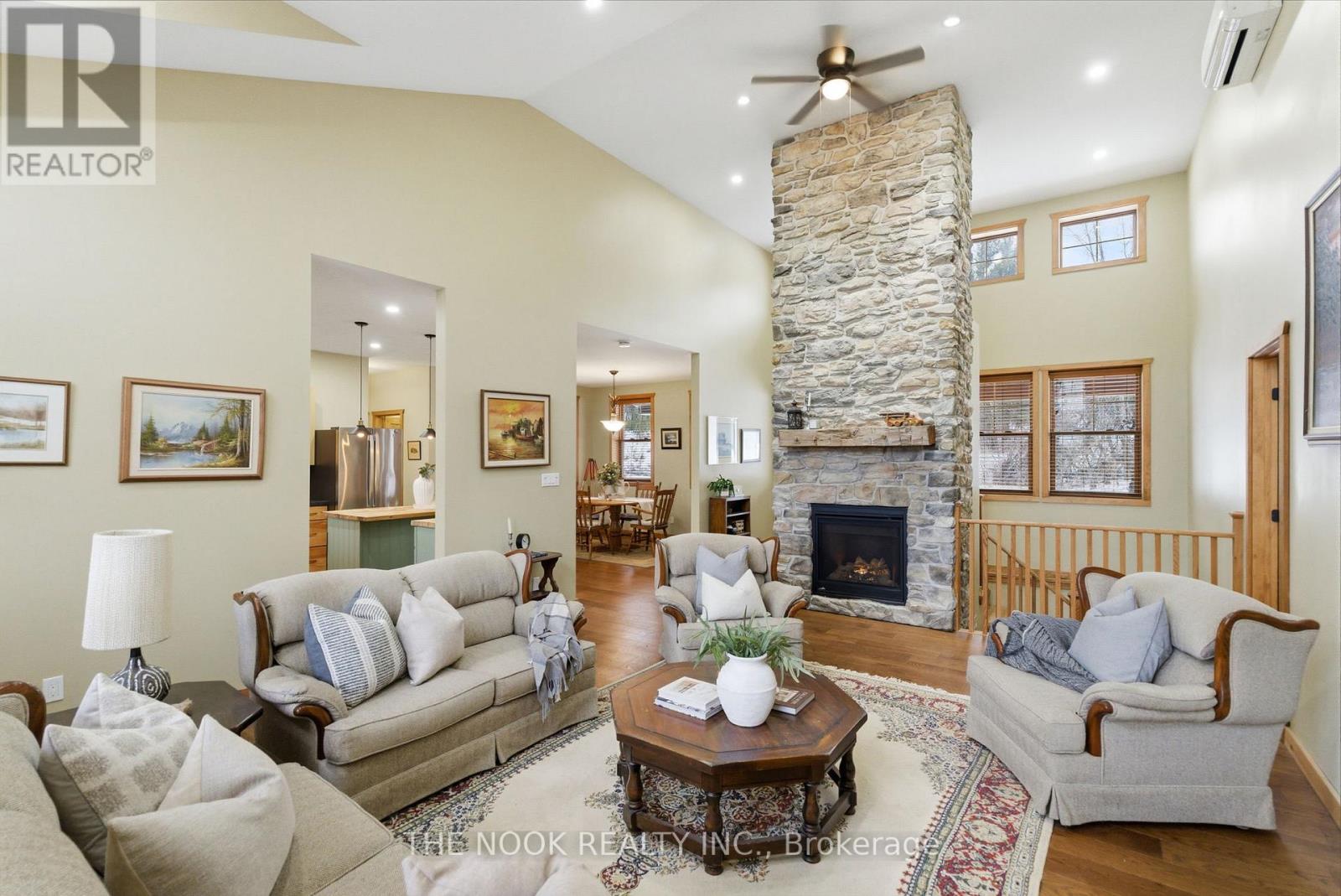 Set on just over half an acre in a quiet lakeside neighbourhood, this exceptional 4-year-old home offers stunning views of Rice Lake and an unparalleled indoor/outdoor lifestyle. A public dock and boat launch are conveniently located within 200 metres, making this an ideal property for boating and lake enthusiasts.Designed with a unique, sun-filled open-concept layout, the home offers approximately 2,400 sq ft of finished living space with 9' ceilings throughout and a dramatic 15' vaulted ceiling on the main floor. At the heart of the home is a massive central stone fireplace, complemented by a propane fireplace on the main level and a wood-burning fireplace in the lower level, creating warmth and character year-round.The main floor features a spacious primary bedroom with a private covered porch, a beautifully appointed ensuite, main floor laundry, and abundant storage and closet space. The finished walk out lower level offers two large bedrooms, a full bath, and additional living space ideal for family or guests. Hardwood and ceramic flooring flow throughout the home, adding timeless style and durability.Built for comfort and efficiency, the home boasts super-insulated walls and ceilings, in-floor hydronic heating on all levels, and a propane boiler providing both heat and hot water. Three mini-split units offer supplemental heating and air conditioning.Car, hobby, and recreational enthusiasts will appreciate the oversized four-car over/under garage, complete with a 9,000 lb Atlas two-post hoist, in-floor heat in the lower garage, propane radiant heat in the upper garage, air compressor plumbing on both levels, welder plug, RV hookups, and extensive storage for cars, boats, and campers.With covered front and rear porches, breathtaking lake views, and thoughtfully designed spaces throughout, this remarkable property offers comfort, functionality, and a lifestyle rarely found. (id:61423)