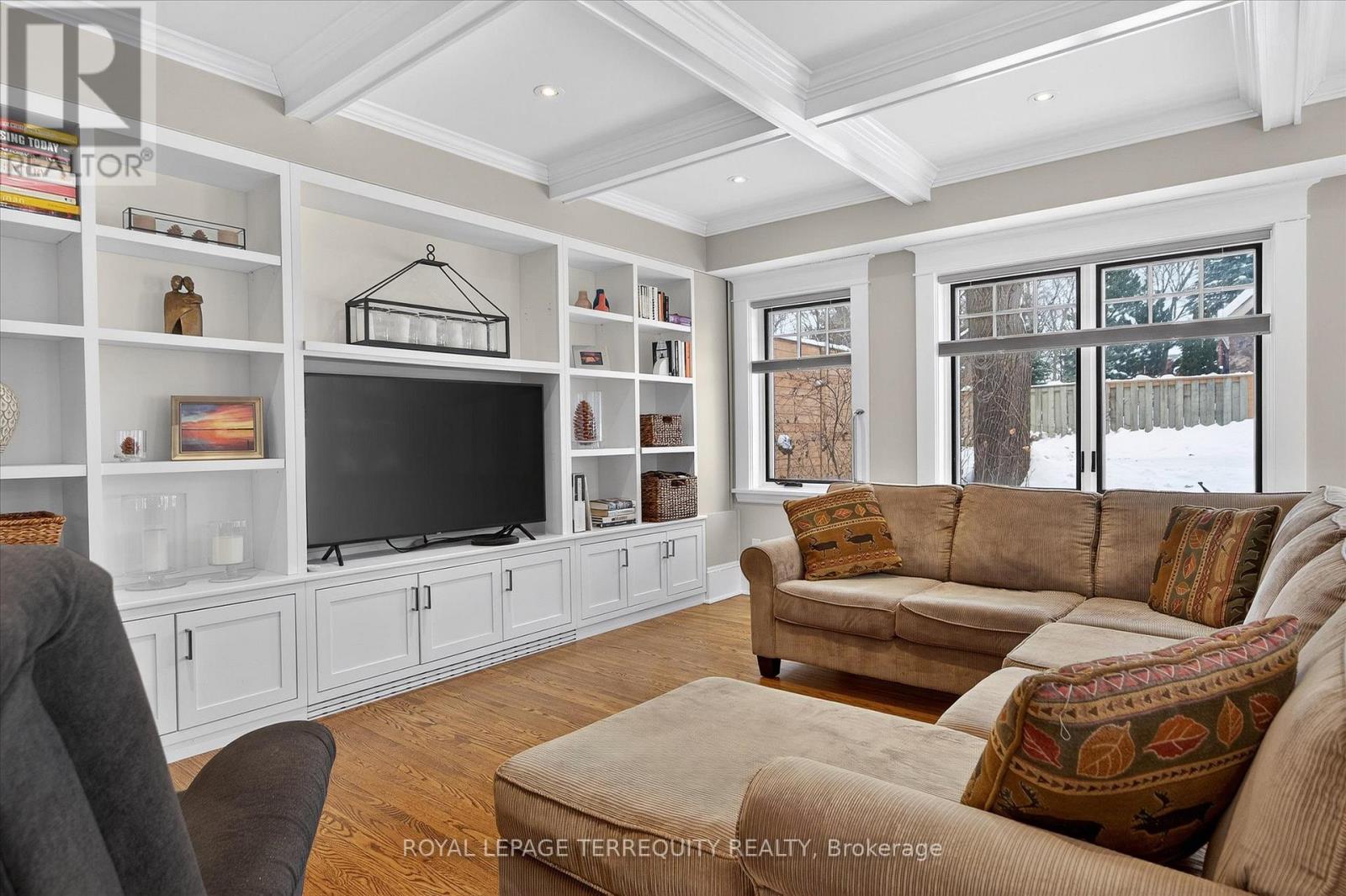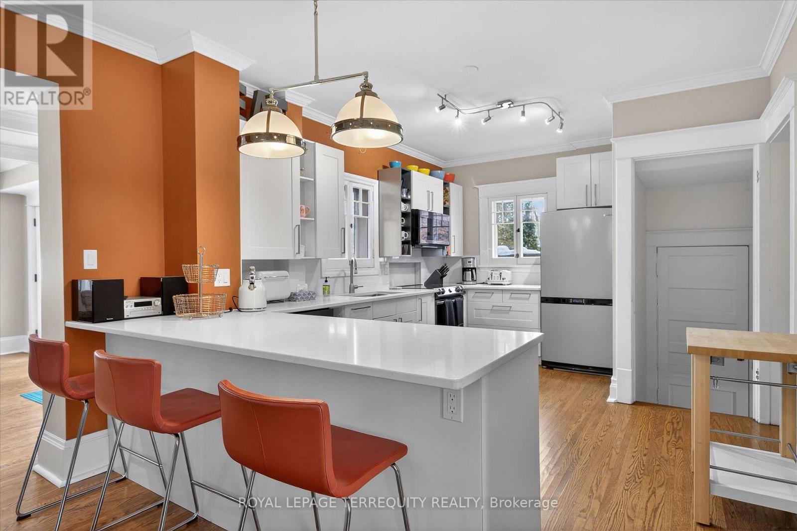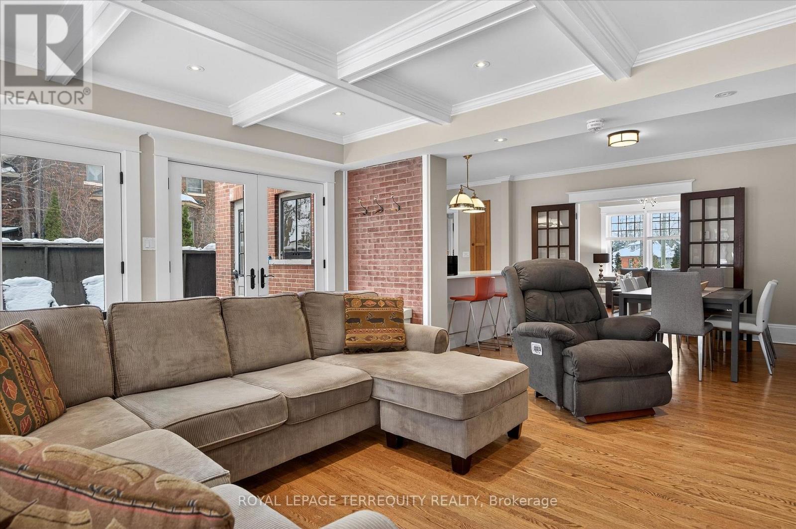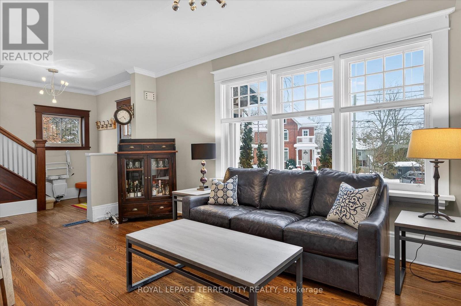 Welcome to this beautiful inviting character home, perfectly situated on a quiet, tree-lined street in the highly sought-after Teachers College neighbourhood of Peterborough. This prime location offers the rare combination of peaceful residential living with the convenience of being able to walk, bus or drive just minutes to downtown amenities. This spacious four-bedroom, three-bathroom home, plus a main floor powder room, blends timeless charm with thoughtful modern updates. The large living room features a wood-burning fireplace, creating a warm welcoming space for relaxing evenings. From here, the home flows seamlessly into an open-concept kitchen, dining and living area, ideal for entertaining family and friends. A standout feature is the 2-storey addition completed in 2015, designed to enhance both comfort and connection to the outdoors. The expansive family room boasts coffered ceilings, built-in cabinetry and shelving, large windows and two walk-out doors leading to a generous patio deck with wide views of the rear property. The home also offers wheel-chair accessibility through the rear entrance and deck adding versatility and thoughtful design. Hardwood flooring extends throughout the home.The primary bedroom retreat offers a spacious walk-in closet and four-piece ensuite bathroom. Enjoy the exceptional lifestyle with the Rotary Trail, Parks, biking paths, and river just steps away. A short walk brings you to downtown Peterborough's restaurants, shopping, hockey and sports facilities. ** This is a linked property.** (id:61423)