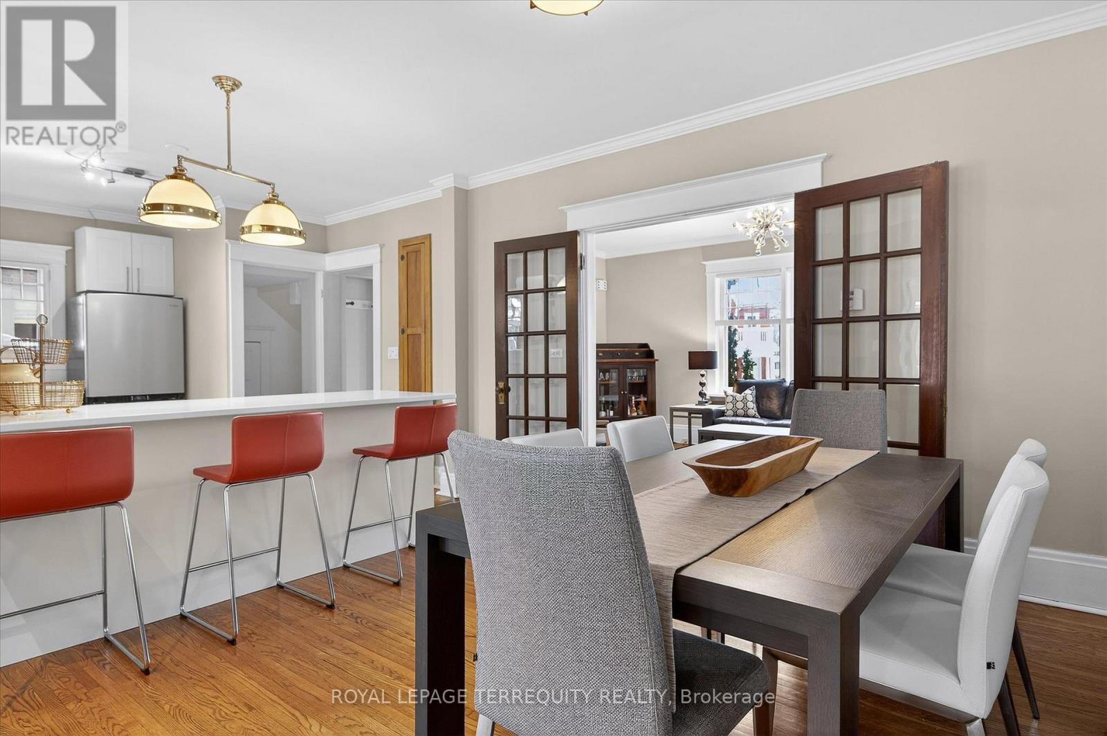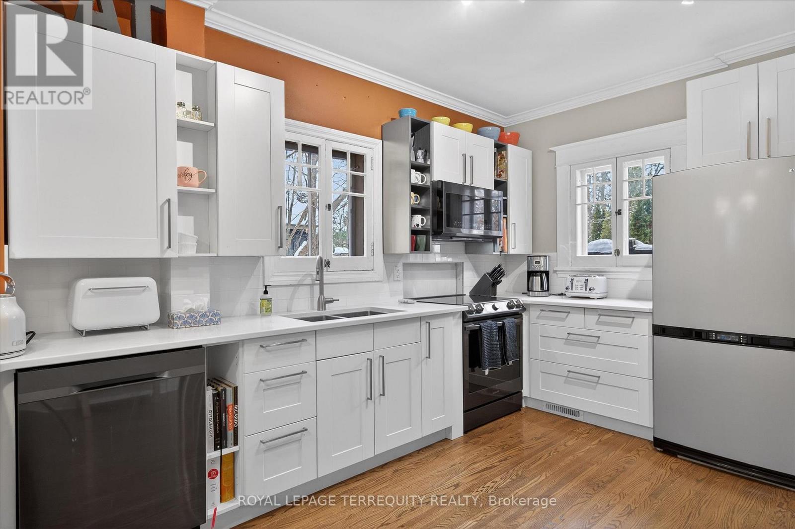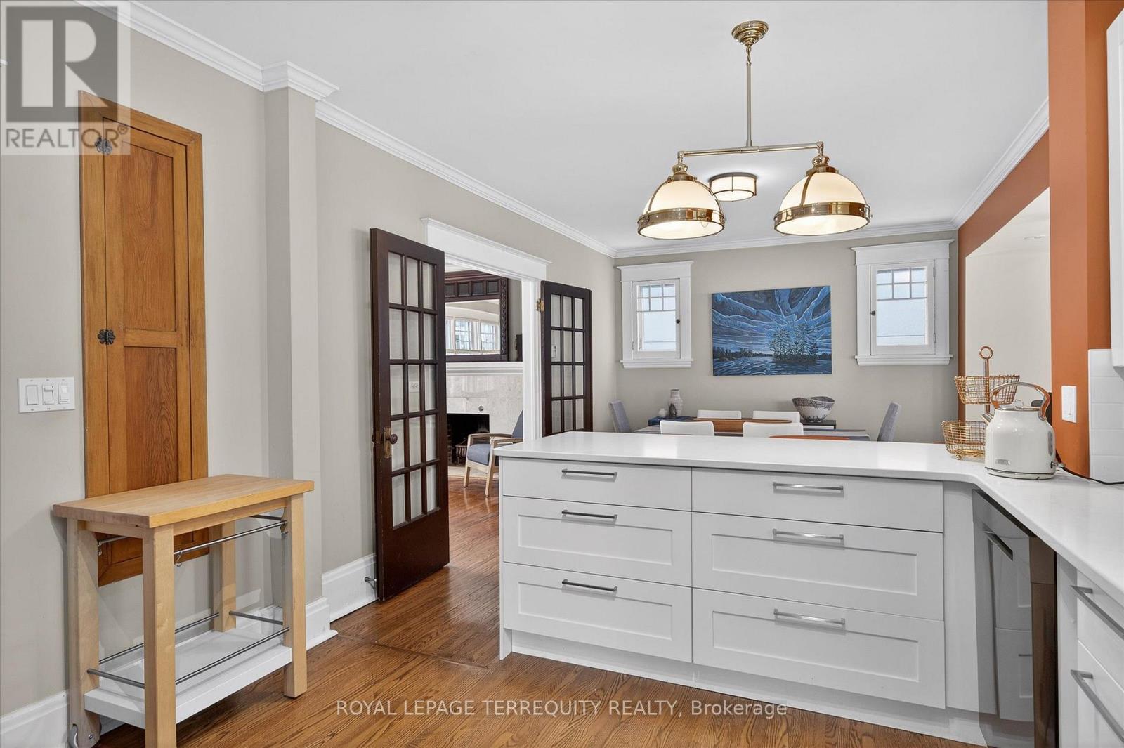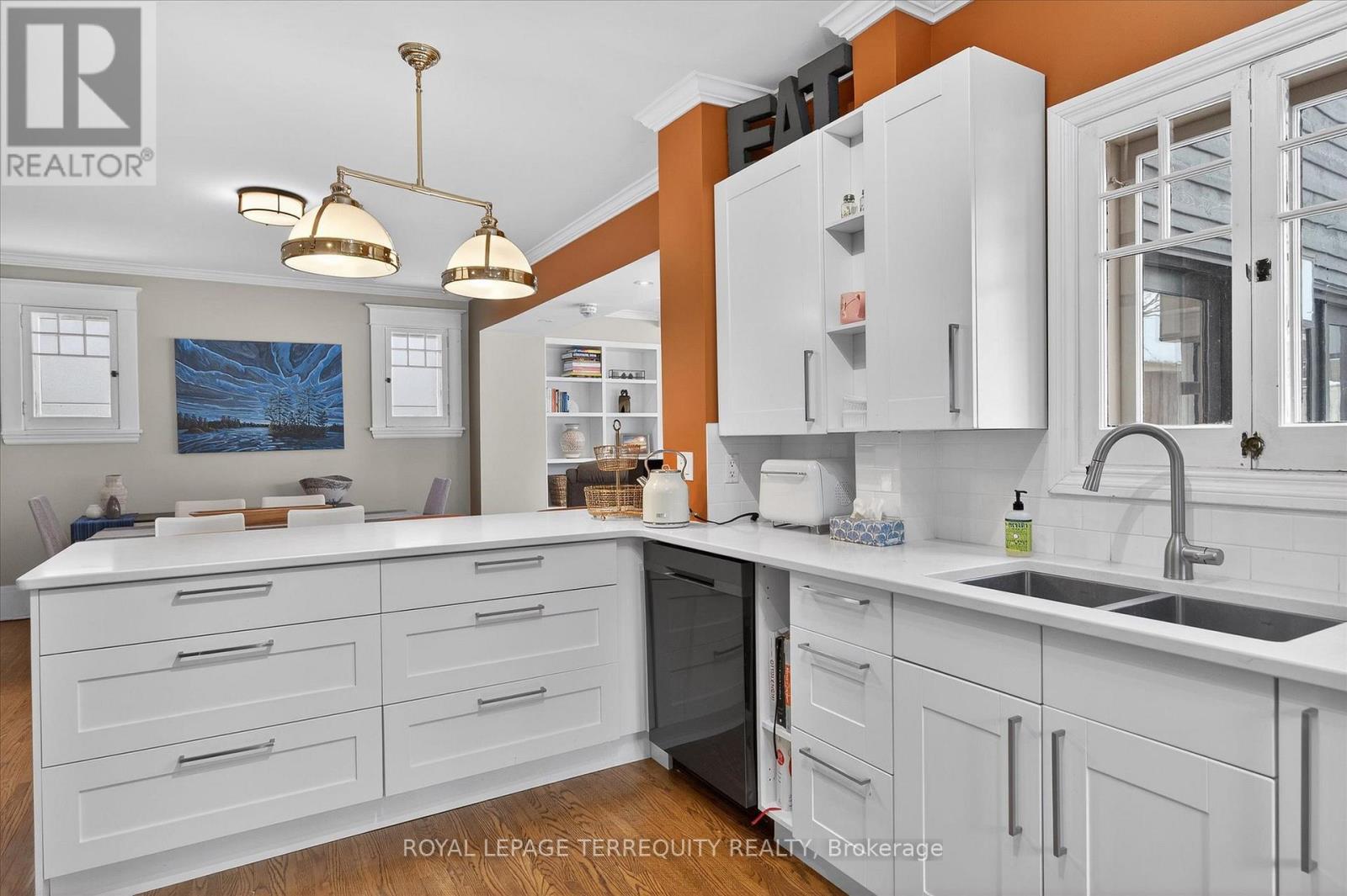 Welcome to this beautiful inviting character home, perfectly situated on a quiet, tree-lined street in the highly sought-after Teachers College neighbourhood of Peterborough. This prime location offers the rare combination of peaceful residential living with the convenience of being able to walk, bus or drive just minutes to downtown amenities. This spacious four-bedroom, three-bathroom home, plus a main floor powder room, blends timeless charm with thoughtful modern updates. The large living room features a wood-burning fireplace, creating a warm welcoming space for relaxing evenings. From here, the home flows seamlessly into an open-concept kitchen, dining and living area, ideal for entertaining family and friends. A standout feature is the 2-storey addition completed in 2015, designed to enhance both comfort and connection to the outdoors. The expansive family room boasts coffered ceilings, built-in cabinetry and shelving, large windows and two walk-out doors leading to a generous patio deck with wide views of the rear property. The home also offers wheel-chair accessibility through the rear entrance and deck adding versatility and thoughtful design. Hardwood flooring extends throughout the home.The primary bedroom retreat offers a spacious walk-in closet and four-piece ensuite bathroom. Enjoy the exceptional lifestyle with the Rotary Trail, Parks, biking paths, and river just steps away. A short walk brings you to downtown Peterborough's restaurants, shopping, hockey and sports facilities. ** This is a linked property.** (id:61423)