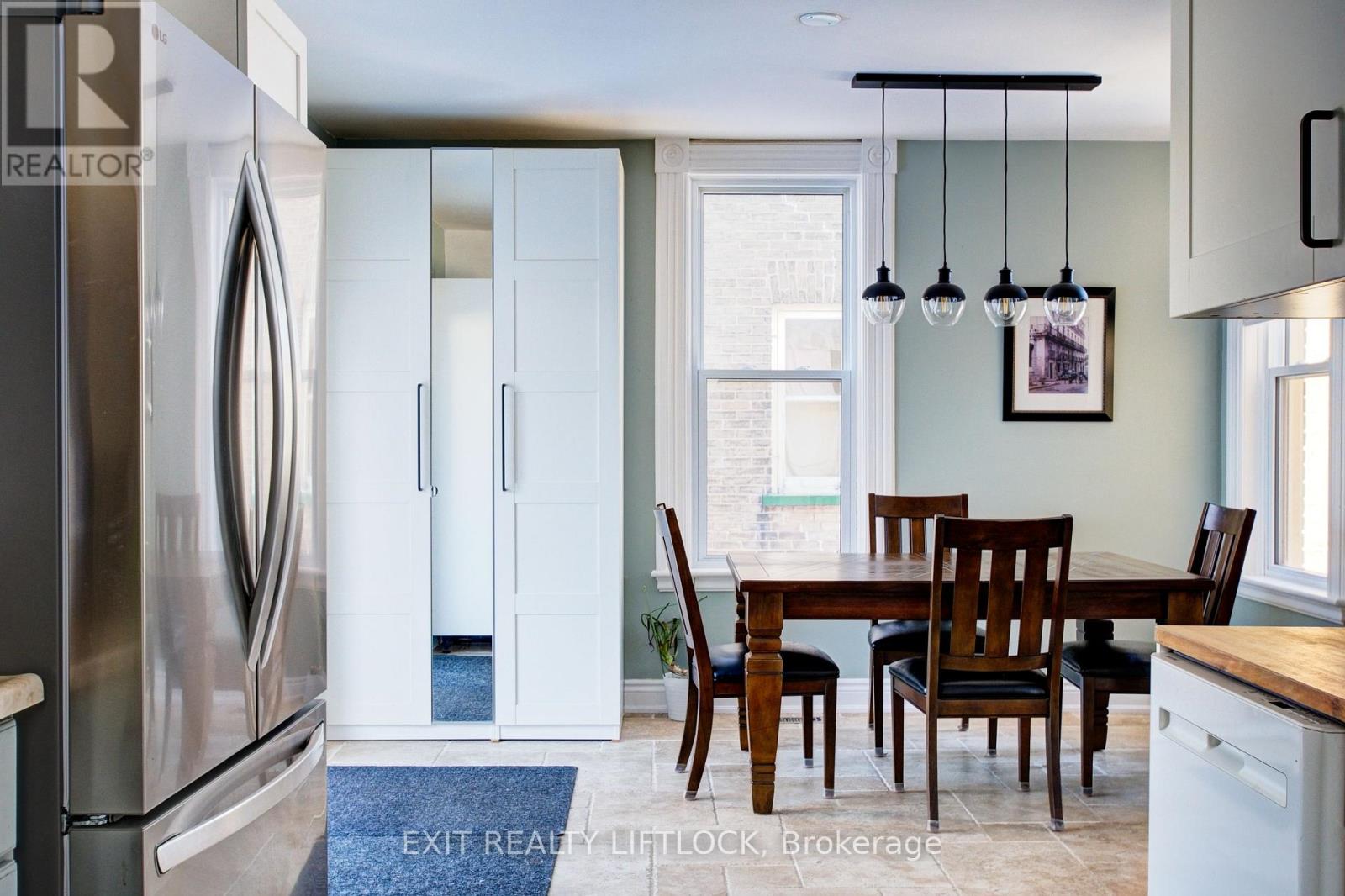If you have been looking for a home with character, this all brick 2.5 storey century home delivers. Travertine flooring from the front entry carries through to the kitchen and dining area, where there is plenty of space for family meals, hosting, and everyday living. The main floor includes a comfortable living room with hardwood flooring, a 2 piece bath, and a sliding door that opens to a large deck and fenced backyard. Whether it's kids running around, pets enjoying the yard, or quiet evenings outside, this space is ready for it. Upstairs offers three bedrooms and a full bathroom, plus a bonus loft on the top floor. It is unheated and not included as finished space, but it is a great bonus area for play, hobbies, or a creative studio. In the back yard is a detached heated 1.5 car garage with workshop. This home blends classic style with everyday practicality. Easy access to downtown, shopping, bus route, and schools. Home inspection is available upon request. (id:61423)