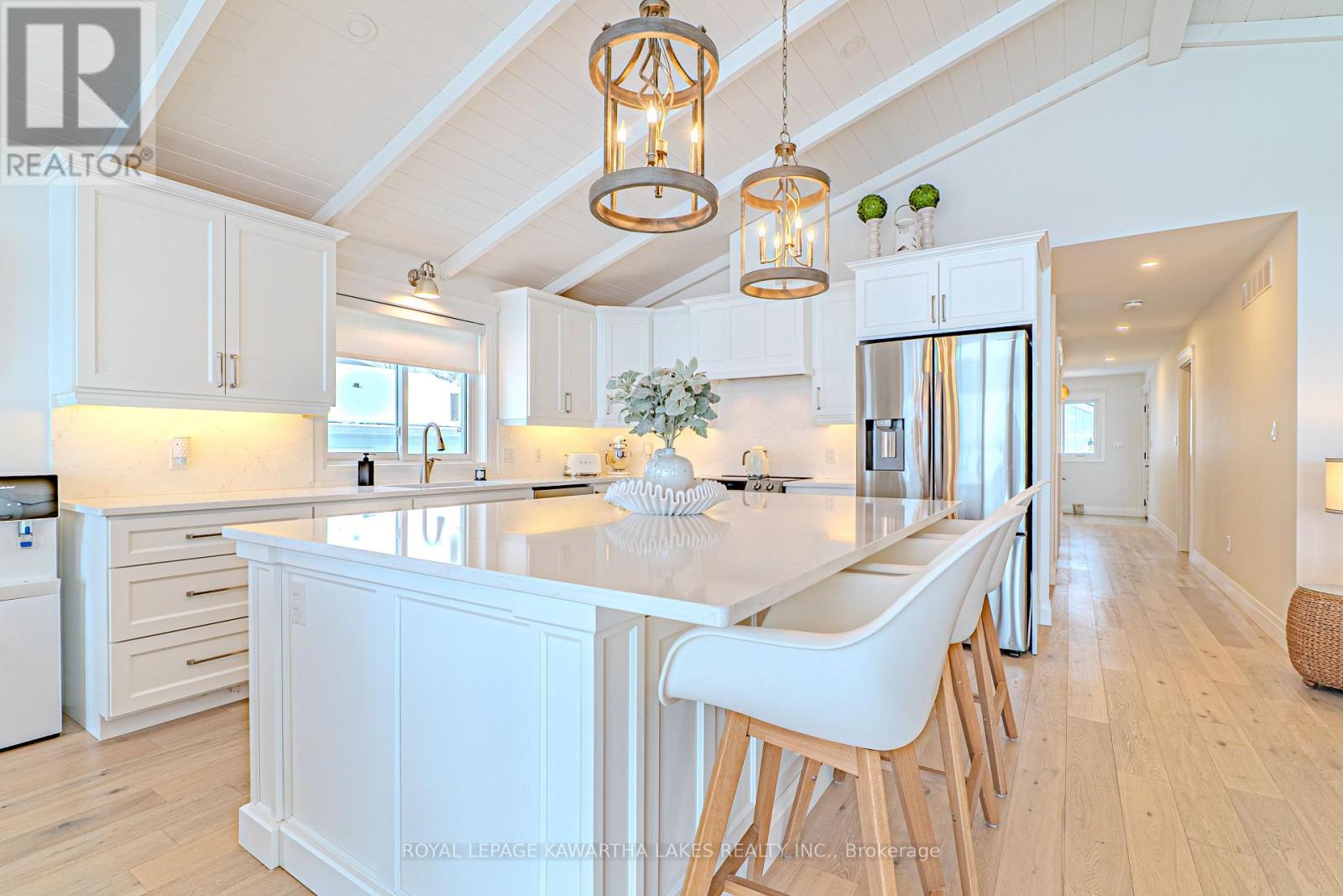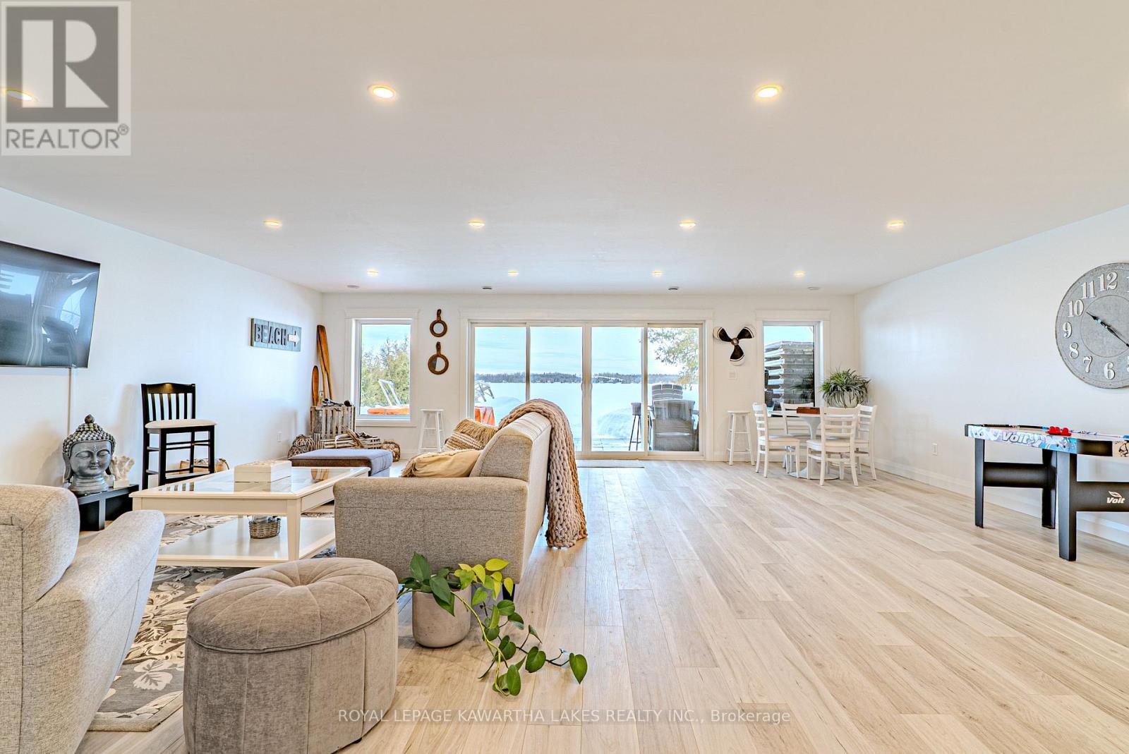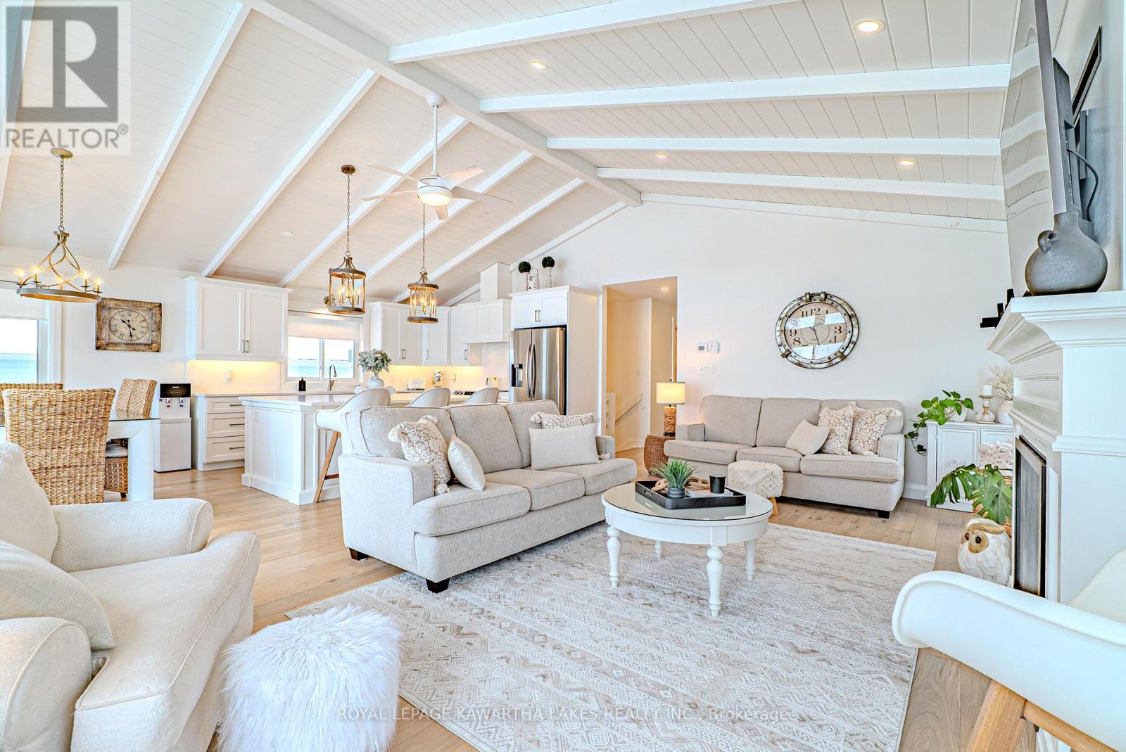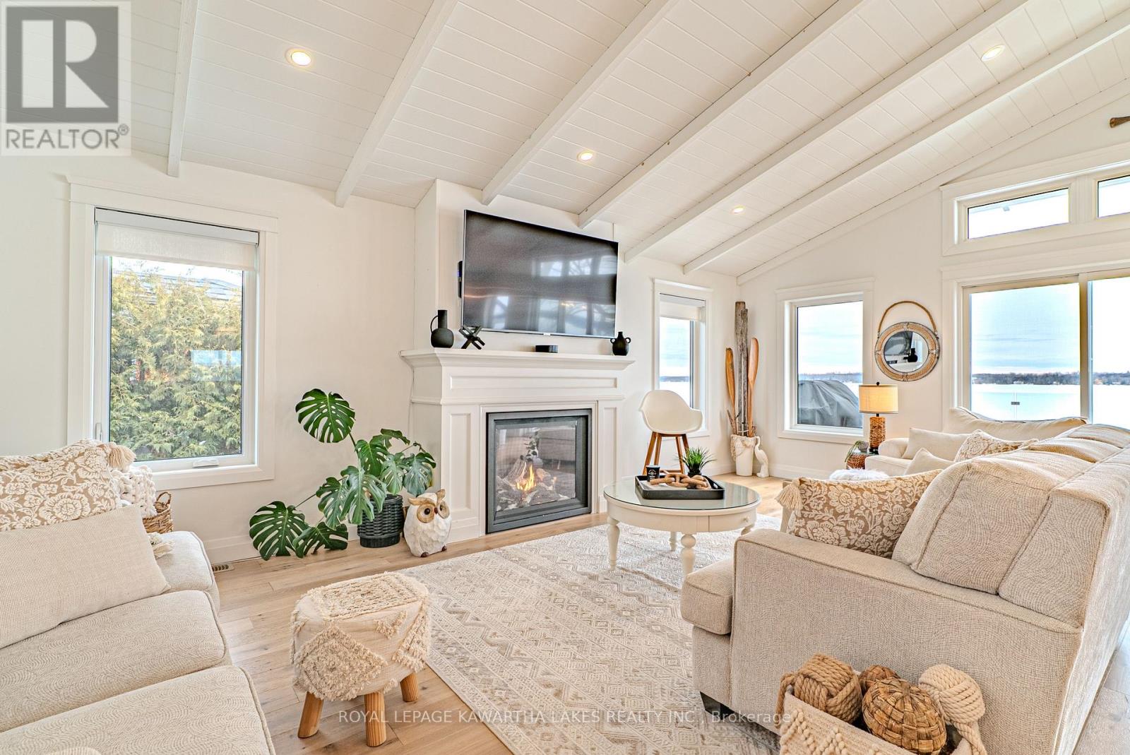 Welcome to effortless waterfront living on sought-after Sturgeon Lake. With 50 ft of clean, sandy shoreline and a private dock, this property offers the perfect blend of relaxation and year-round comfort. Step inside to a bright, airy foyer that opens to a stunning open-concept living space designed around the view. The custom white kitchen features a substantial 5.5 x 7.5 ft centre island, ample cabinetry and seamless flow to the dining and living areas - ideal for entertaining or quiet mornings overlooking the water. Vaulted ceilings, engineered hardwood flooring and a cozy propane fireplace create a warm yet refined atmosphere, while expansive windows frame uninterrupted lake views. The main floor offers two generous bedrooms, both with walk-in closets, including a primary suite complete with a private 3-piece ensuite. A well-appointed 4-piece bathroom completes the level. The fully finished walkout lower level extends the living space with a spacious recreation room and direct access to the lakeside yard - perfect for guests, family gatherings, or summer evenings by the water. This level also includes an additional bedroom, 4-piece bathroom, laundry room, storage room and unfinished utility space. Whether enjoyed as a full-time residence or a waterfront retreat, this home delivers comfort, style and a connection to the lake in every season. (id:61423)