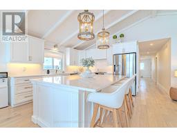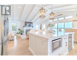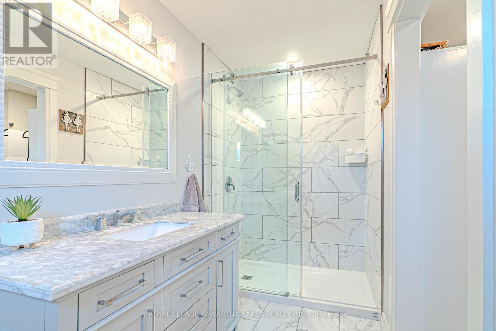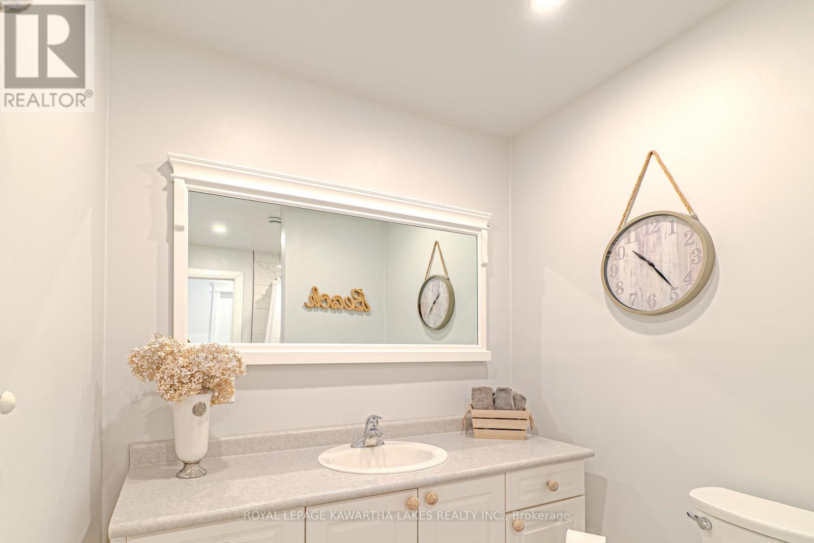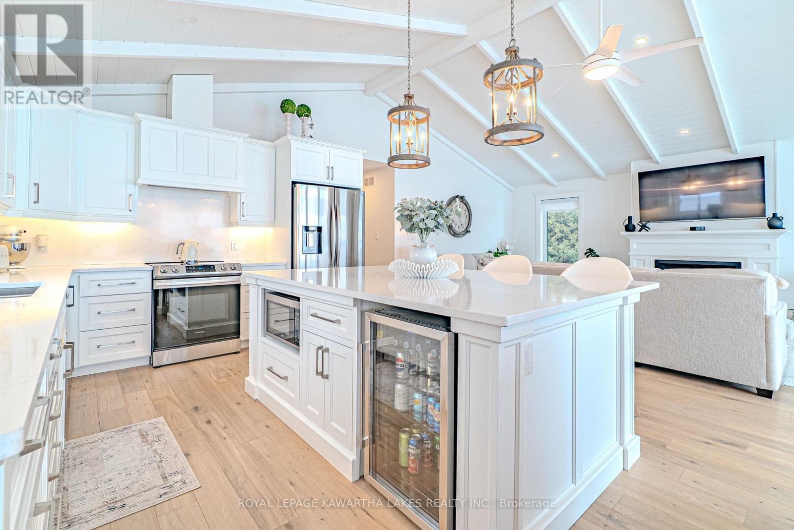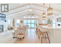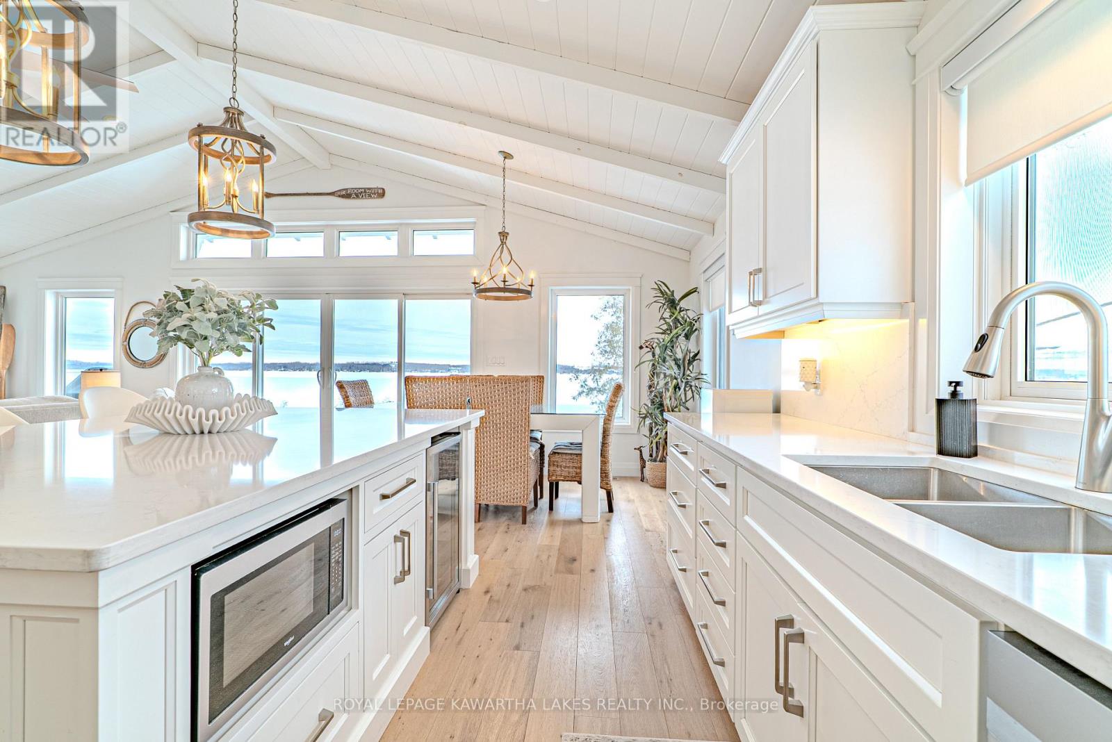 Welcome to effortless waterfront living on sought-after Sturgeon Lake. With 50 ft of clean, sandy shoreline and a private dock, this property offers the perfect blend of relaxation and year-round comfort. Step inside to a bright, airy foyer that opens to a stunning open-concept living space designed around the view. The custom white kitchen features a substantial 5.5 x 7.5 ft centre island, ample cabinetry and seamless flow to the dining and living areas - ideal for entertaining or quiet mornings overlooking the water. Vaulted ceilings, engineered hardwood flooring and a cozy propane fireplace create a warm yet refined atmosphere, while expansive windows frame uninterrupted lake views. The main floor offers two generous bedrooms, both with walk-in closets, including a primary suite complete with a private 3-piece ensuite. A well-appointed 4-piece bathroom completes the level. The fully finished walkout lower level extends the living space with a spacious recreation room and direct access to the lakeside yard - perfect for guests, family gatherings, or summer evenings by the water. This level also includes an additional bedroom, 4-piece bathroom, laundry room, storage room and unfinished utility space. Whether enjoyed as a full-time residence or a waterfront retreat, this home delivers comfort, style and a connection to the lake in every season. (id:61423)