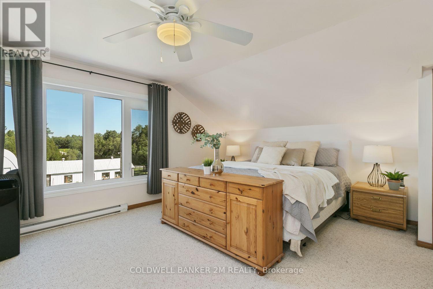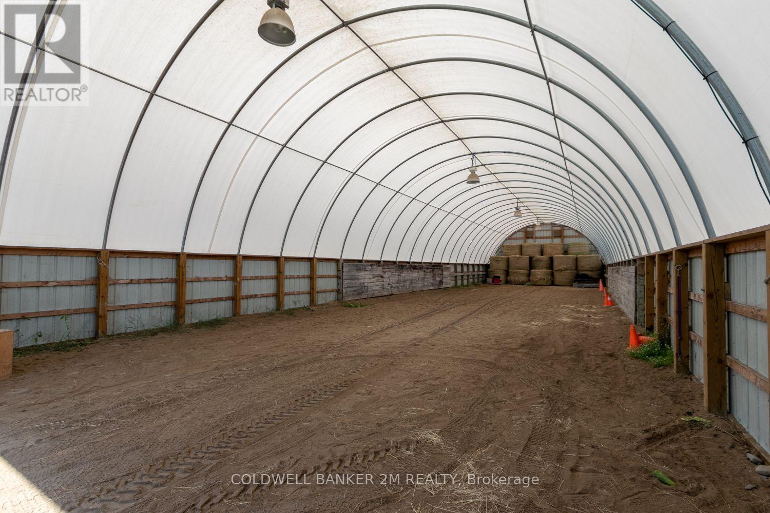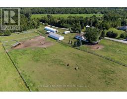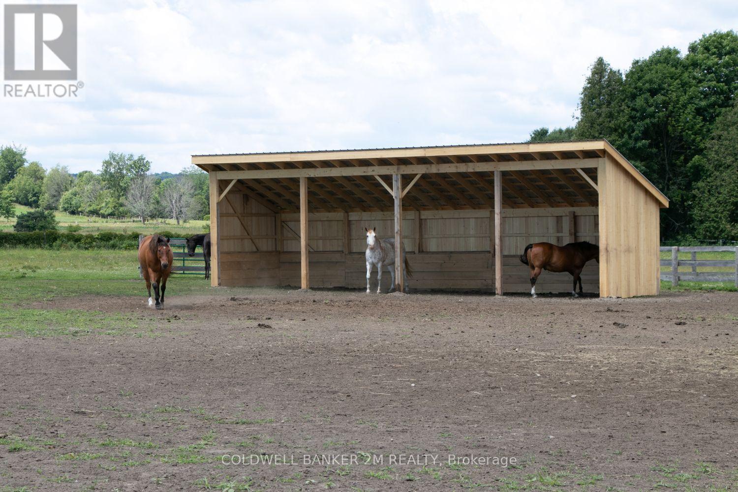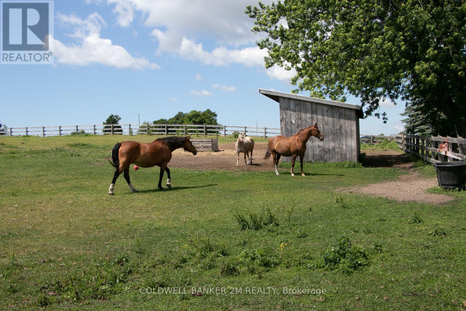 Exceptional equestrian estate sitting on over 61 acres of serene countryside, conveniently close to Hwy 401, 407, 115/35, shopping, schools, and amenities. Spread out in a spacious 2,924 sq ft home featuring 4 bedrooms and large principal rooms overlooking the farm. The sun-filled main floor boasts two walkouts, a large family kitchen with breakfast bar and pantry, bright breakfast area, cozy living room with fireplace, formal dining room, and huge family room with vaulted ceilings. Main floor laundry adds convenience. Upstairs, a grand hallway with computer nook overlooks the main floor. Retreat to the large primary bedroom with walk-in closet and two additional bedrooms. Finished lower level includes a 4th bedroom, rec room, utilities, and workshop. This turnkey property offers a well-established, high-level boarding operation with instant income and opportunity to expand revenue. The property grows its own hay and offers multiple pastures, large fenced paddocks, and three horse shelters (2015, 2017, 2022). Equestrian facilities include a 30 x 90 ft 5-stall barn with hay storage and wall-to-wall matting, 40 x 120 ft covered training arena, 100 x 200 ft outdoor riding arena, 60 ft round pen, 16 x 40 ft shop, and on-property trail. Recent updates include main floor windows and doors (2026), front and patio French doors (2023), kitchen update (2026) entryway and main floor bath flooring (2026), roof (house & garage) (2022), kitchen & appliances (2021), flooring (2022), bedroom window (2019), paint (2022), and lighting (2022). Exterior improvements include barn siding (2017), horse stalls (2017), and over 5,000 ft of wood fencing (2015-2018).Extras: See attached Features List and Floor Plan - plus so much more to see! (id:61423)