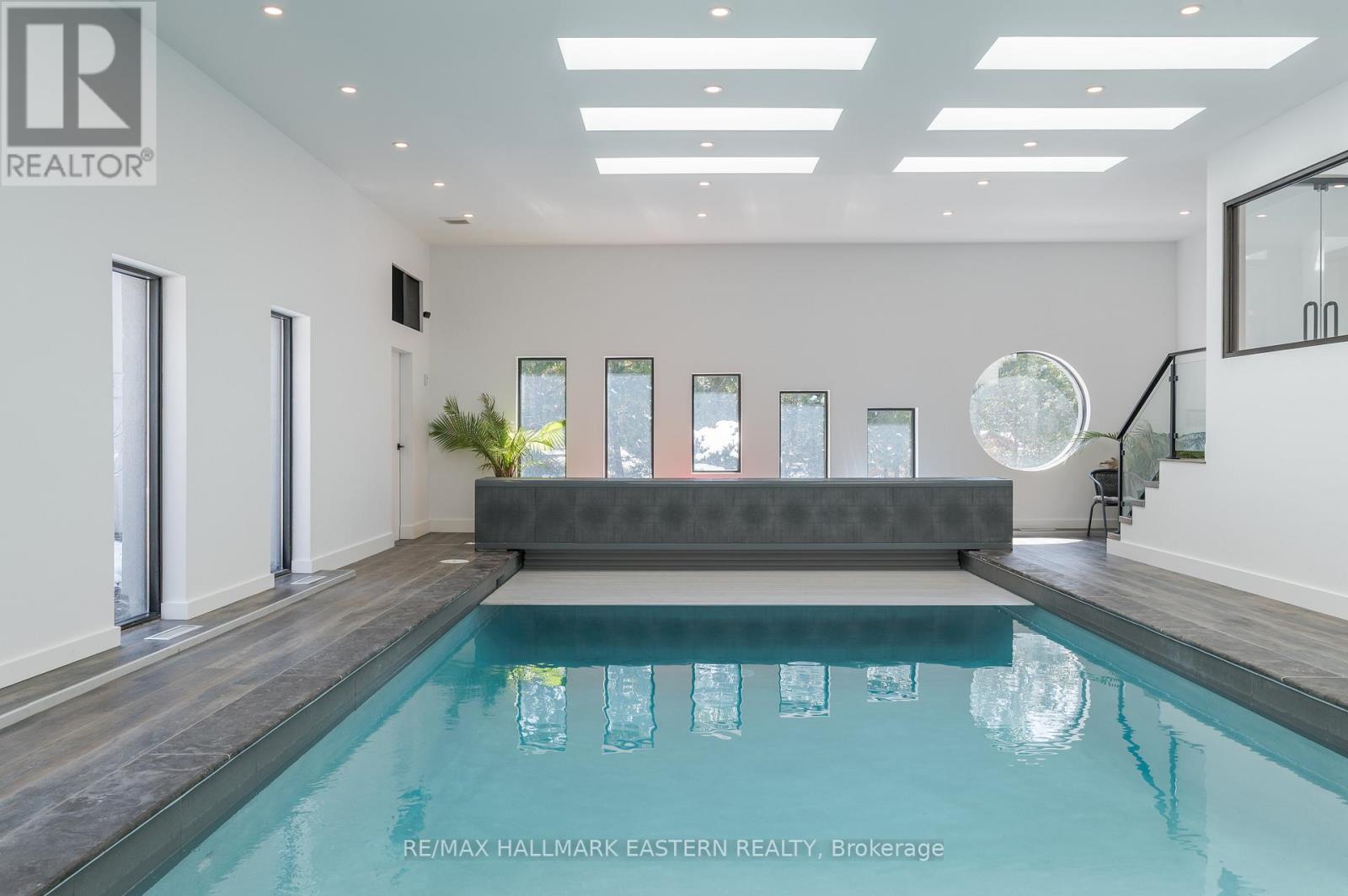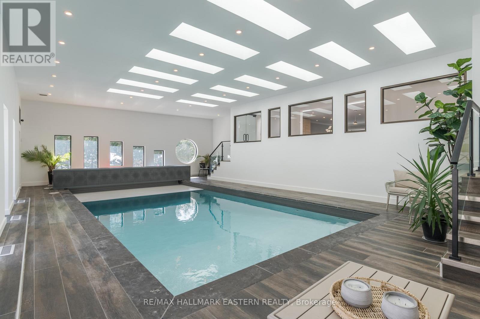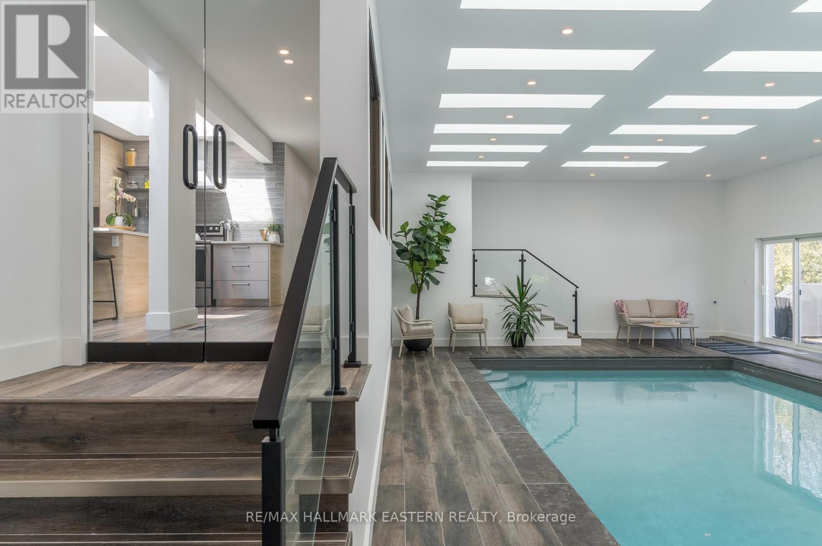Tucked away on a quiet west-end crescent and set on an impressive 90' x 197' treed lot, this beautifully updated executive home delivers over 4,000 sq ft of finished living space-and a feature you simply won't find every day: a private indoor pool. Designed with both everyday living and entertaining in mind, the bright open-concept main floor offers a spacious kitchen, living, and dining area-perfectly positioned to overlook the pool through a striking wall of interior windows. It's a rare and seamless connection between spaces that brings natural light and a true sense of openness throughout the home. The indoor pool area itself is nothing short of impressive, surrounded by 14 skylights and lined with windows that look out to the fenced backyard-creating a light-filled, year-round retreat that feels both private and connected to the outdoors. Complete with a dehumidification system, updated marbelite, and automatic cover, it's a space designed to be enjoyed in every season. The main level also features three generous bedrooms and three beautifully updated bathrooms, while the fully finished lower level offers exceptional flexibility with above-grade windows, a 3-piece bath, and rough-ins for a kitchenette or wet bar-ideal for extended family or in-law potential. Recent upgrades include two gas furnaces, 2 A/C, tankless hot water, updated electrical with EV charging capability, roof, glass railings, and a striking commercial-grade glass entry. A rare offering in a sought-after location-this is a home that truly stands apart. (id:61423)