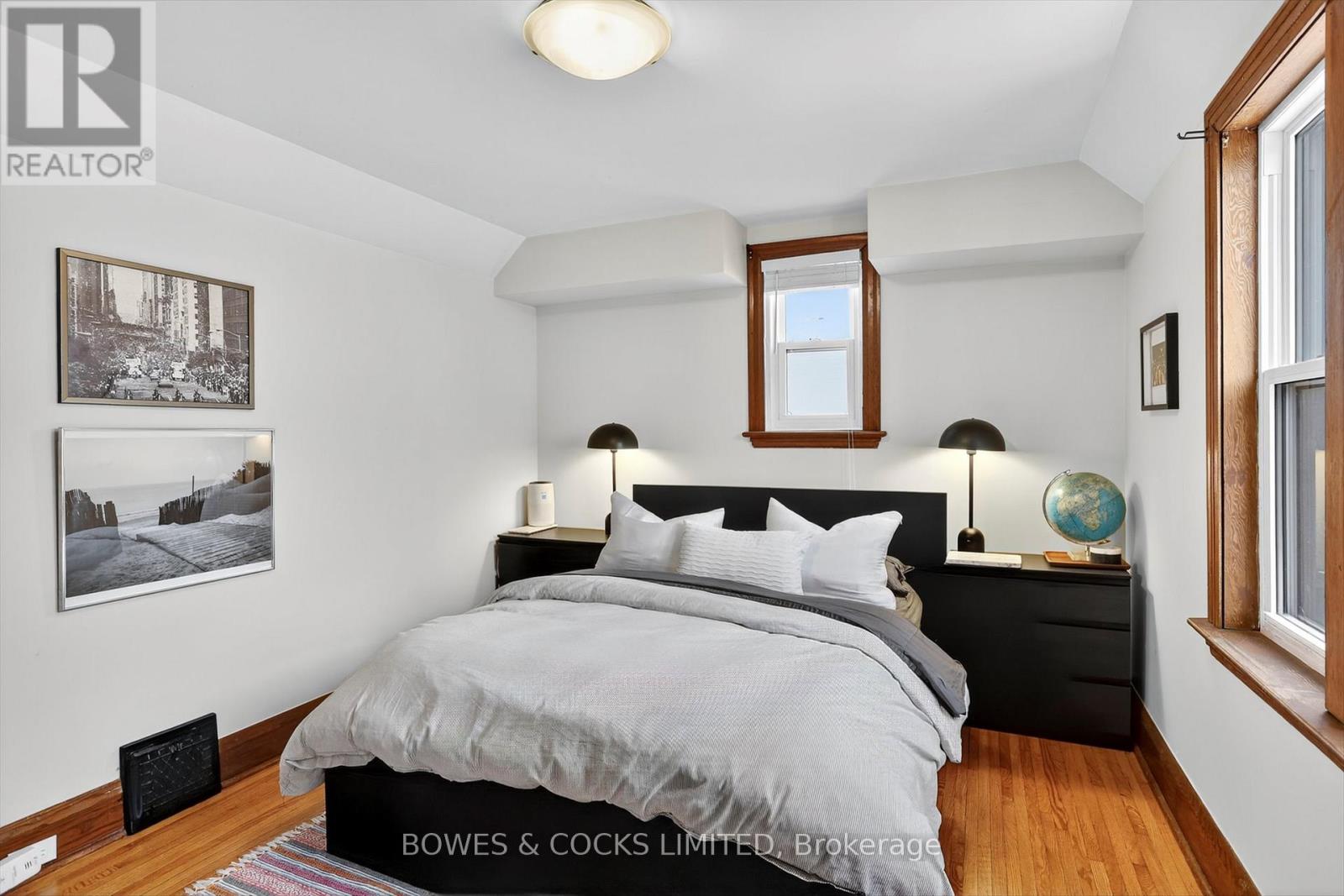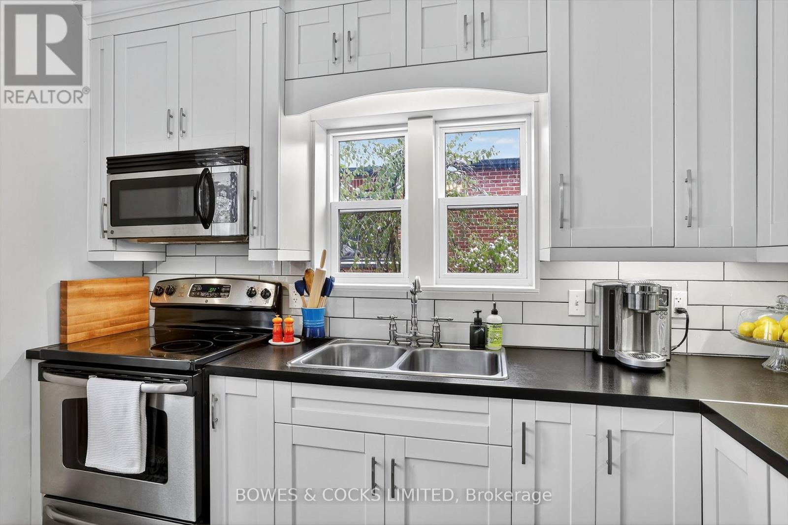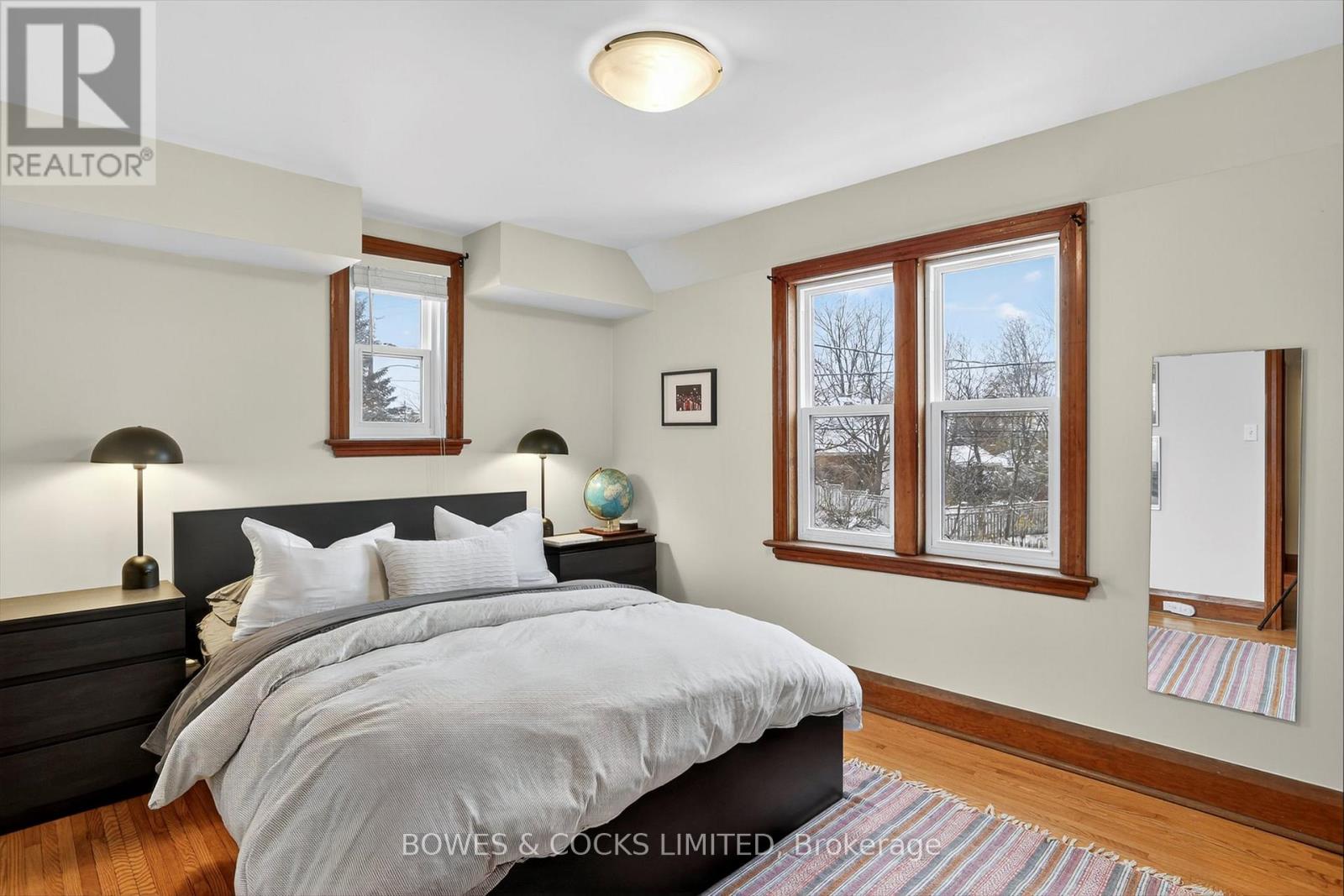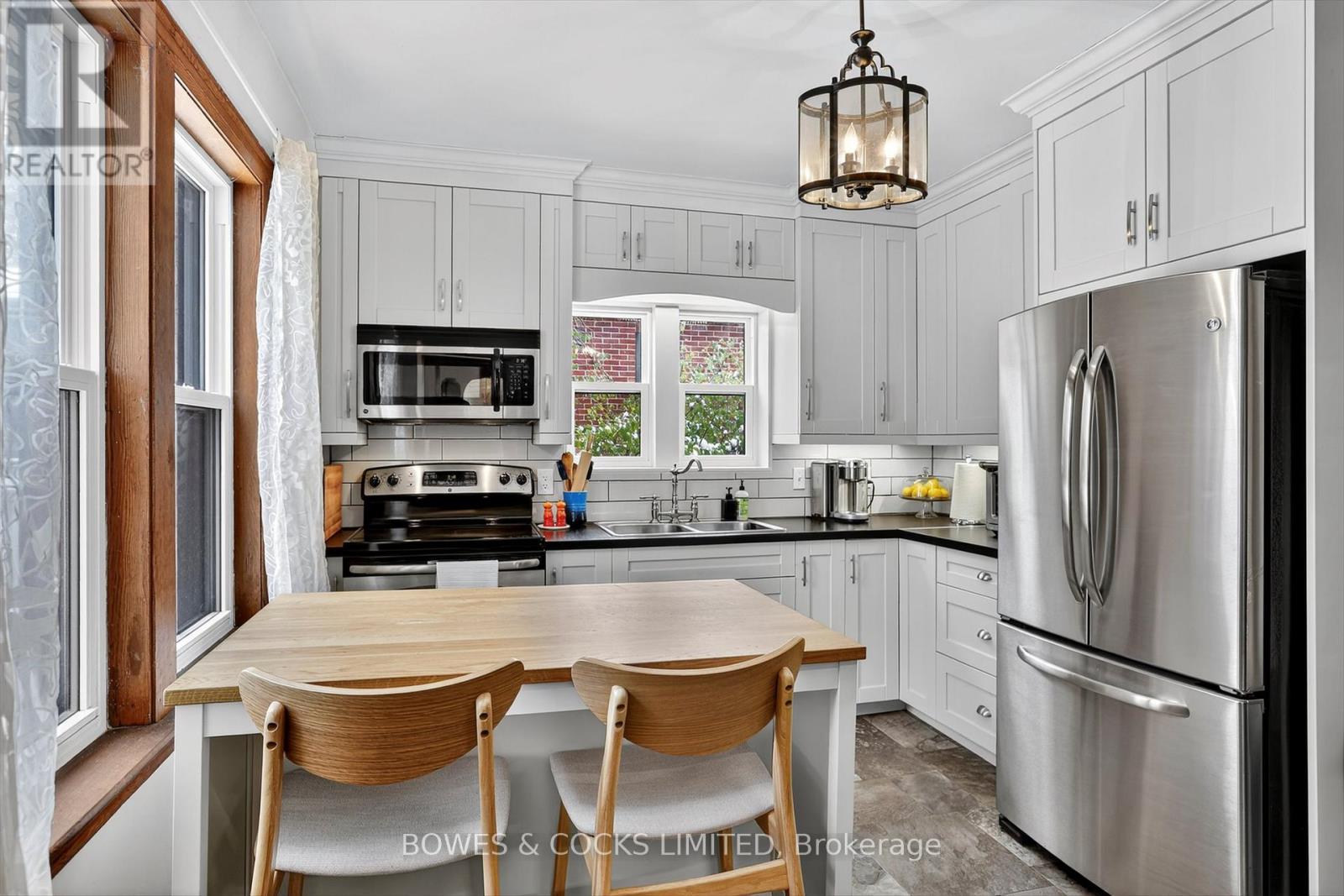 Nestled in the mature trees of Peterborough's historic "Old Teacher's College" neighbourhood, this midcentury gem is emblematic of an adventurous era in architectural design. The two storey all brick "International Style" design features a charming arched front door, corner windows, and a flat roof. Fully renovated in 2013, with updated furnace, electrical work, appliances, a new insulated roof, and new windows on the main and second levels, this home retains its original warm wood floors, trim, and historical details while enjoying the benefits of modern updates. The main floor contains an open living space on the north side, while the south side has alight-filled kitchen, a main floor laundry, and a 2 piece washroom. Going up the beautiful wide wooden stairs to the second floor reveals 3 comfortable bedrooms and an updated 4-piecewashroom.The basement currently serves as a generous storage area, and also features an attached one car garage which opens up to a driveway with space for two parked cars. The spacious back yard is bordered by mature maple trees with a newer premium fence and features tasteful gardens and hedge with a central patio perfect for socializing with friends and family. The restaurants and amenities of downtown, as well as the grocery stores and big box stores of Chemong Rd are close by, with Jackson and Bonnerworth parks just a short drive away. Come see this unique property today! (id:61423)