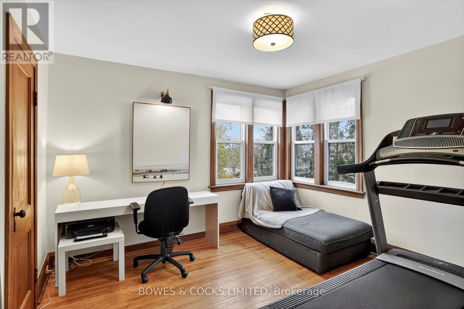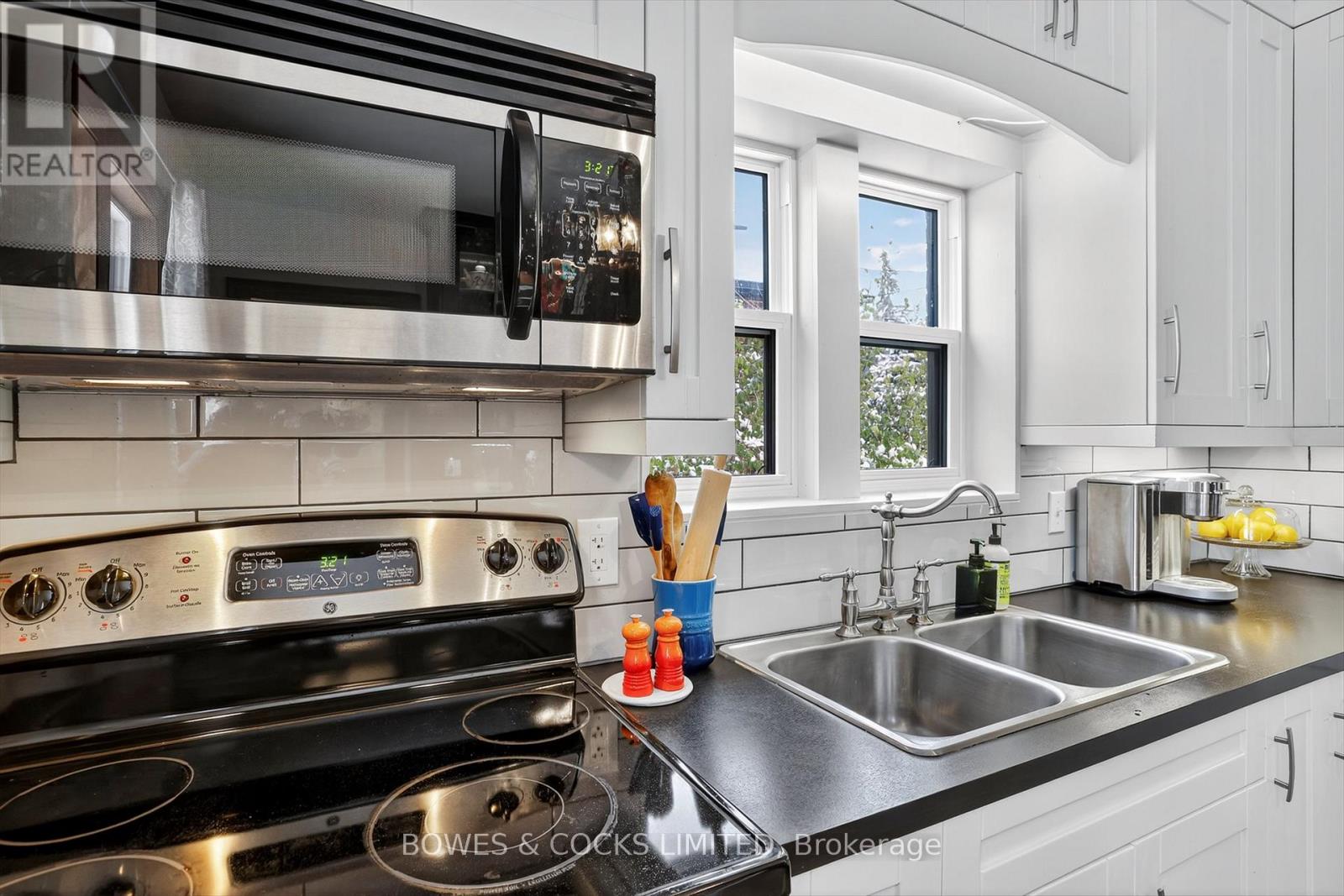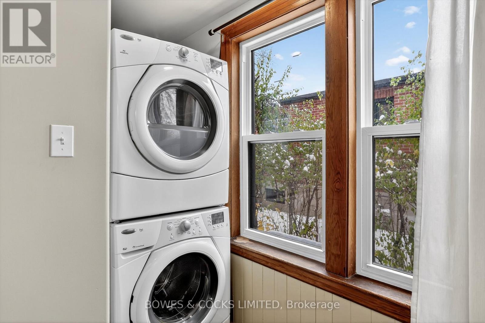 Nestled in the mature trees of Peterborough's historic "Old Teacher's College" neighbourhood, this midcentury gem is emblematic of an adventurous era in architectural design. The two storey all brick "International Style" design features a charming arched front door, corner windows, and a flat roof. Fully renovated in 2013, with updated furnace, electrical work, appliances, a new insulated roof, and new windows on the main and second levels, this home retains its original warm wood floors, trim, and historical details while enjoying the benefits of modern updates. The main floor contains an open living space on the north side, while the south side has alight-filled kitchen, a main floor laundry, and a 2 piece washroom. Going up the beautiful wide wooden stairs to the second floor reveals 3 comfortable bedrooms and an updated 4-piecewashroom.The basement currently serves as a generous storage area, and also features an attached one car garage which opens up to a driveway with space for two parked cars. The spacious back yard is bordered by mature maple trees with a newer premium fence and features tasteful gardens and hedge with a central patio perfect for socializing with friends and family. The restaurants and amenities of downtown, as well as the grocery stores and big box stores of Chemong Rd are close by, with Jackson and Bonnerworth parks just a short drive away. Come see this unique property today! (id:61423)