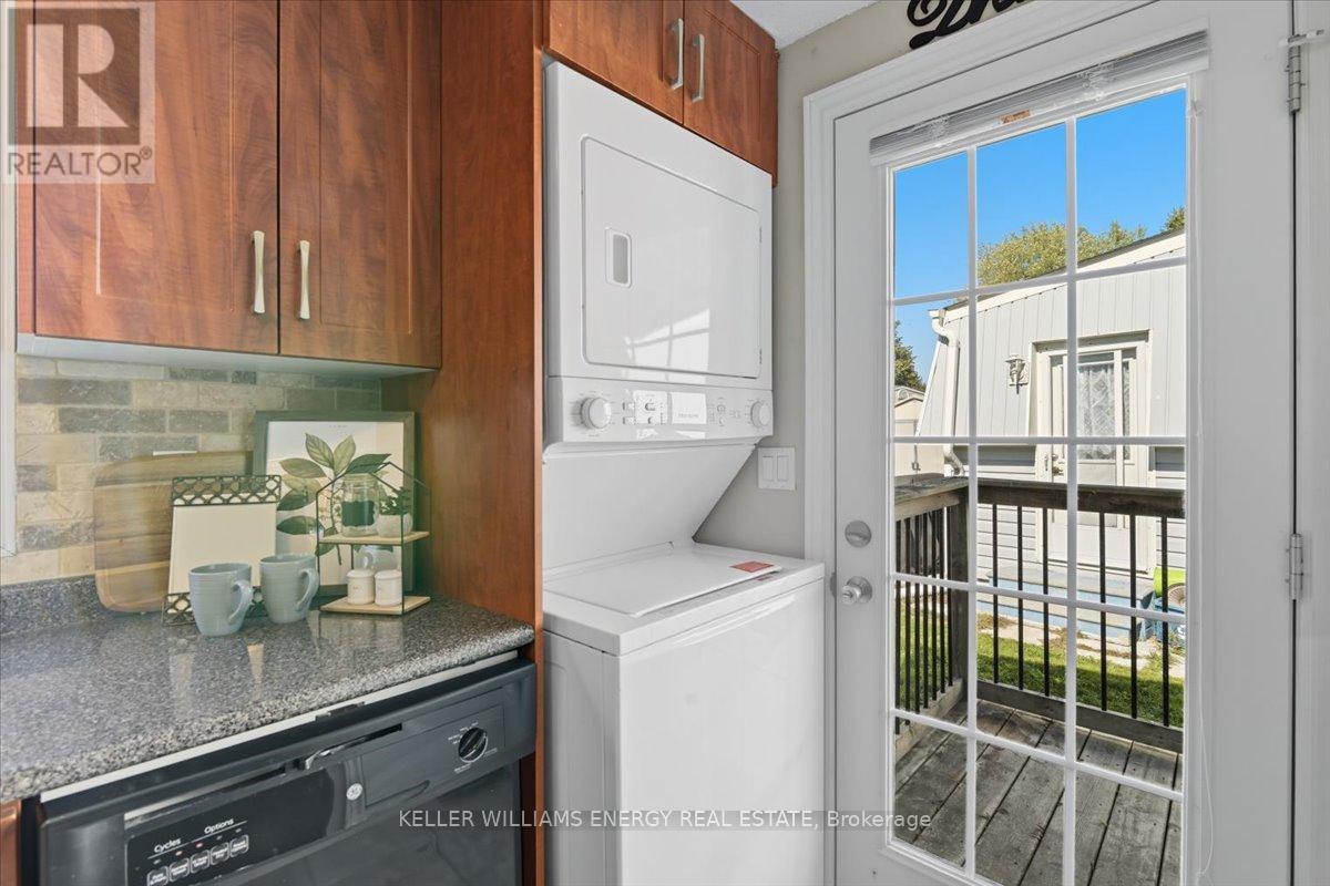 Welcome to 79 Fairway Drive, a charming bungalow tucked away in the sought-after adult lifestyle community of Wilmot Creek, just steps from Lake Ontario. Here, you'll find the perfect blend of peace, privacy, and vibrant community living, all within minutes of Newcastles charming downtown shops, restaurants, and cafes. This lovingly updated 2-bedroom, 1-bathroom home offers a bright, beach-inspired interior with hardwood floors and crown moulding throughout. The open-concept living area flows effortlessly to your private back deck, ideal for morning coffee or a glass of wine at sunset. The stylish kitchen boasts a double stainless steel sink, gleaming countertops, a tumbled marble subway tile backsplash, built-in pantry, and a convenient nook for your stackable washer and dryer. A side entrance with a ramp provides easy access from the driveway, making unloading groceries a breeze. The renovated 3-piece bathroom feels like a spa retreat with its walk-in shower, built-in bench, and glass enclosure. The spacious primary suite features a large closet, while the second bedroom offers versatile space for guests, a home office, or hobby room. No compromises here. Step outside to enjoy beautifully landscaped gardens, a large back deck complete with a 10' x 10' gazebo, plus abundant storage with two bins, a built-in storage area for your tools and toys, and a generous shed.Living at Wilmot Creek means more than just owning a home,its about embracing a resort-style lifestyle. Residents enjoy access to a private 9-hole golf course, heated indoor and outdoor pools, tennis and pickleball courts, scenic lakefront trails, multiple clubhouses, and even a woodworking shop. A private gated entrance adds security and peace of mind, so you can truly relax and enjoy. Whether youre downsizing, retiring, or simply seeking carefree living by the lake, this home offers the perfect next chapter. (id:61423)