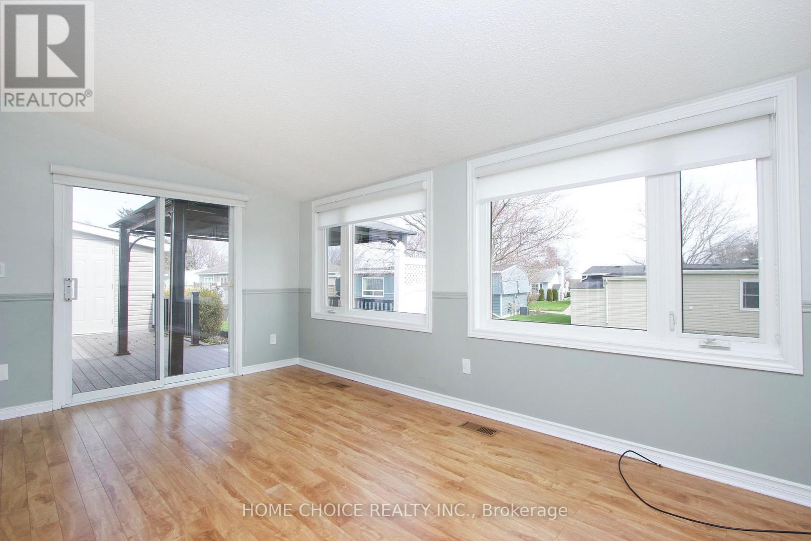Welcome to this beautifully updated detached bungalow in Wilmot Creek, a sought-after adult lifestyle community set along the shores of Lake Ontario. This renovated home features numerous upgrades, including a charming front enclosed porch-perfect for relaxing and enjoying the peaceful surroundings. Inside, you'll find a bright, open-concept layout with spacious principal rooms and a seamless flow, ideal for comfortable, low-maintenance living. The home is designed to offer both functionality and warmth, making it easy to entertain or simply unwind. Enjoy the benefits of a vibrant, resort-style community where your lease includes driveway snow plowing and road maintenance, as well as access to an impressive range of amenities. These include a 9-hole golf course, recreation centre, swimming pools, gym, sauna, tennis and pickleball courts, lawn bowling, and more. With over 80 organized activities-such as cards, shuffleboard, darts, billiards, dances, and live performances-there's always something to enjoy. Experience a lifestyle that blends comfort, convenience, and community in a serene lakeside setting. (id:61423)
