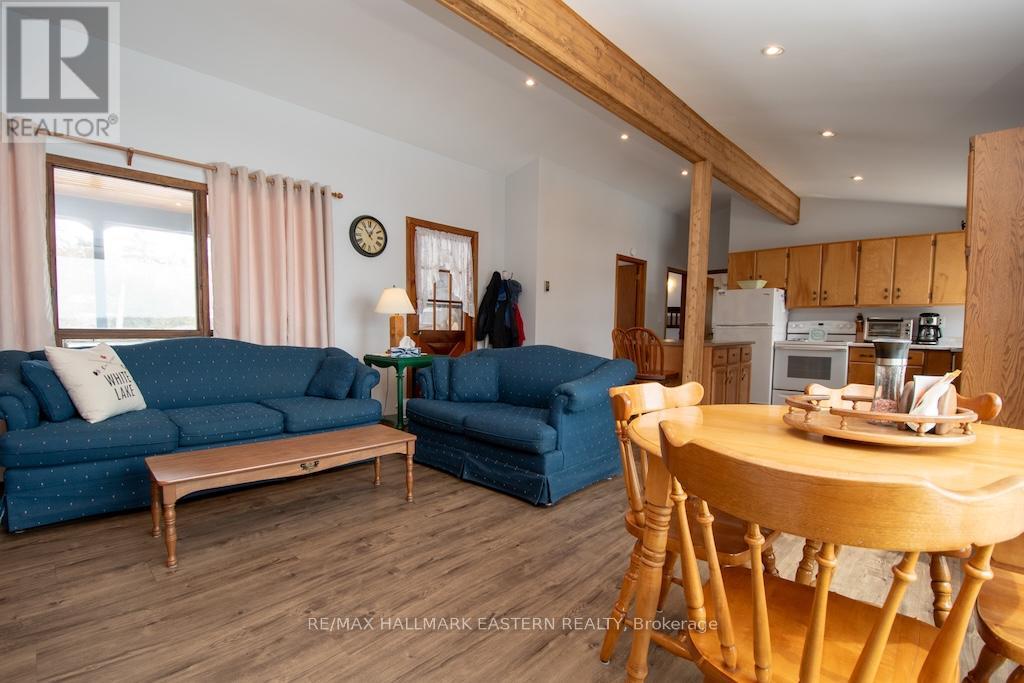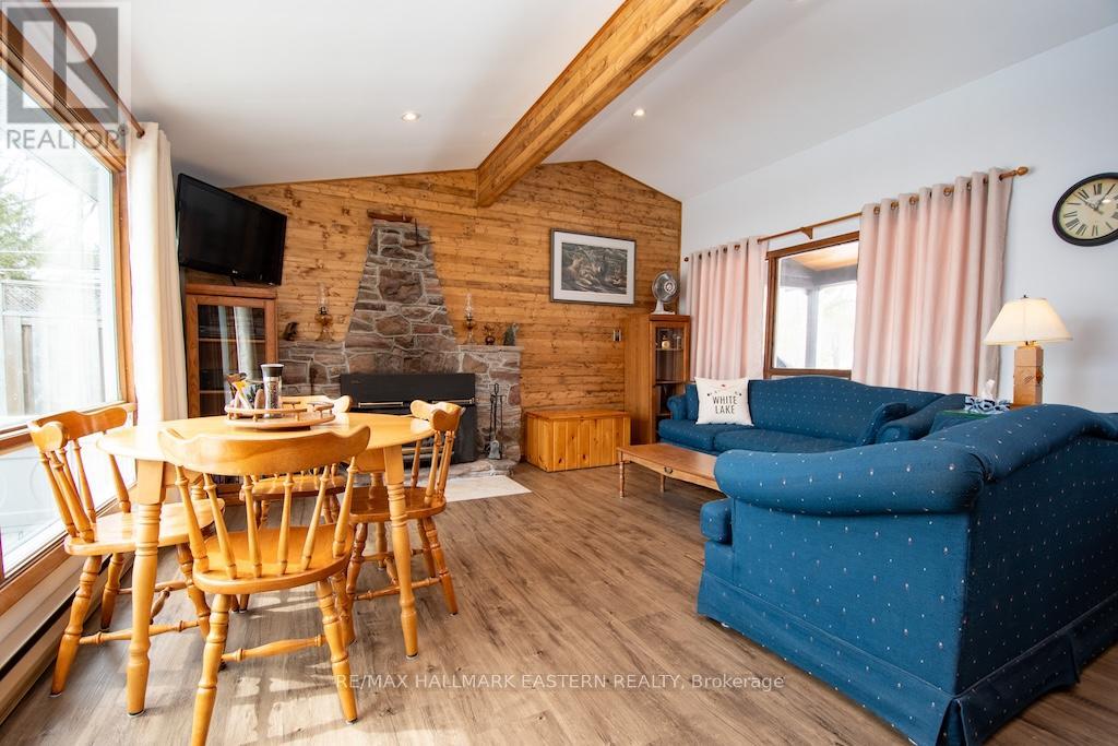 Quaint well-kept year-round home or cottage on beautiful White Lake sitting on a private level property with panoramic lake views offering 3 bedrooms. This home is turn-key ready and features recent upgrades such as new flooring throughout and a steel roof. Front covered deck and rear patio to enjoy lakeside living. Open concept kitchen, dining area and living room which features a beautiful stone fireplace. Extra large window in the living room for stunning lake views year-round. Matching appliances with eat-in kitchen island. Includes modernized bathroom with updated walk-in shower. Large detached dual-door garage/boathouse for parking or storage of water toys. The garage offers additional covered patio space to enjoy the serene surroundings. (id:61423)