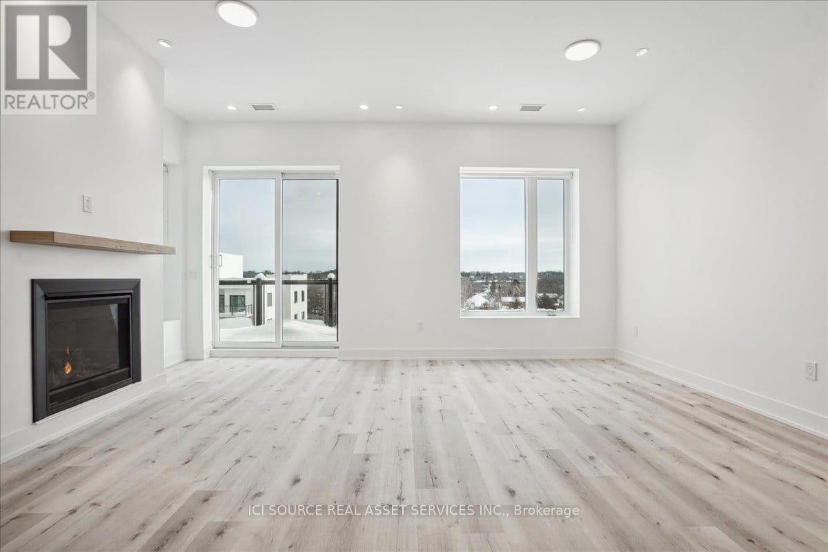 Luxury resort-style penthouse living overlooking Cameron Lake in the heart of Fenelon Falls. This exceptional 1,310 sq ft residence offers breathtaking year-round lake views and a private outdoor terrace designed for relaxed waterfront living. The bright, open-concept layout features 10-ft ceilings, expansive windows, and stylish vinyl flooring throughout. The chef-inspired kitchen is equipped with quartz countertops, stainless steel appliances, a generous center island, and abundant storage-perfect for both everyday living and entertaining. The living and dining area is anchored by a cozy gas fireplace and provides seamless access to the terrace, complete with a gas BBQ hookup. Both bedrooms are impressively sized, including a luxurious primary retreat with its own walk-in closet, and a spa-like 4-piece ensuite. Residents enjoy premium amenities including an outdoor pool, landscaped lounge areas, fitness center - offering true lakeside living with the convenience of being steps from the charm of Fenelon Falls. *For Additional Property Details Click The Brochure Icon Below* (id:61423)